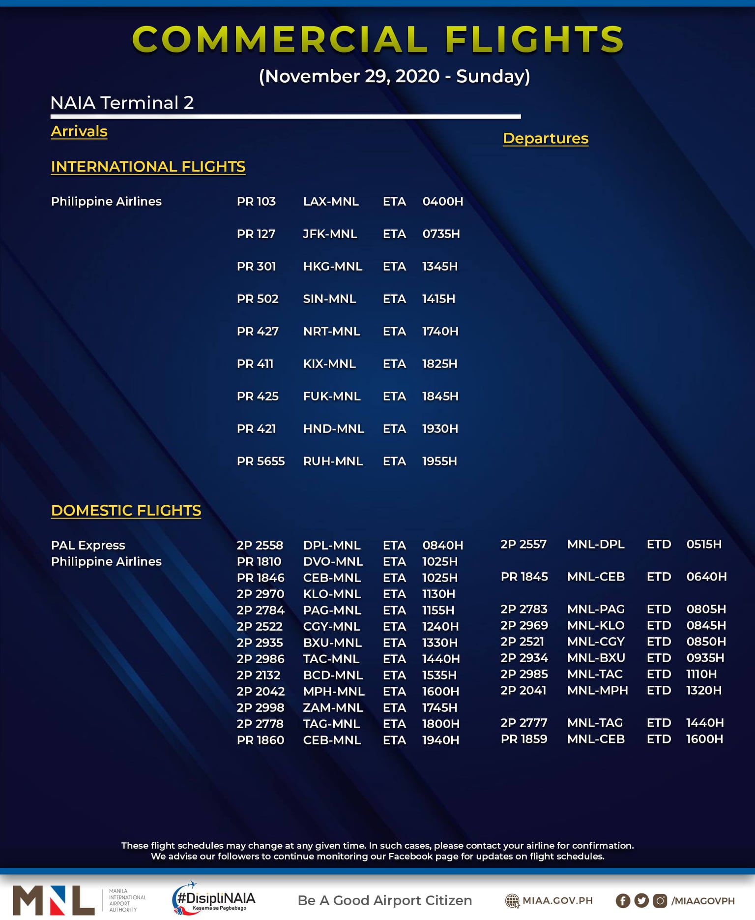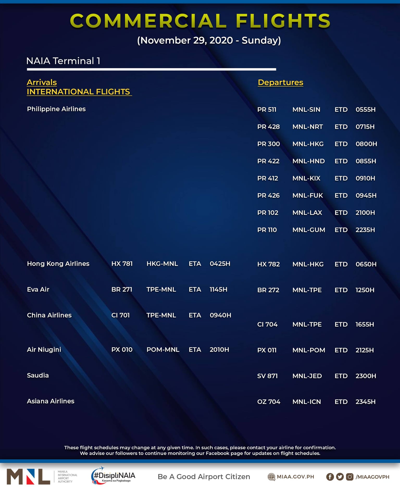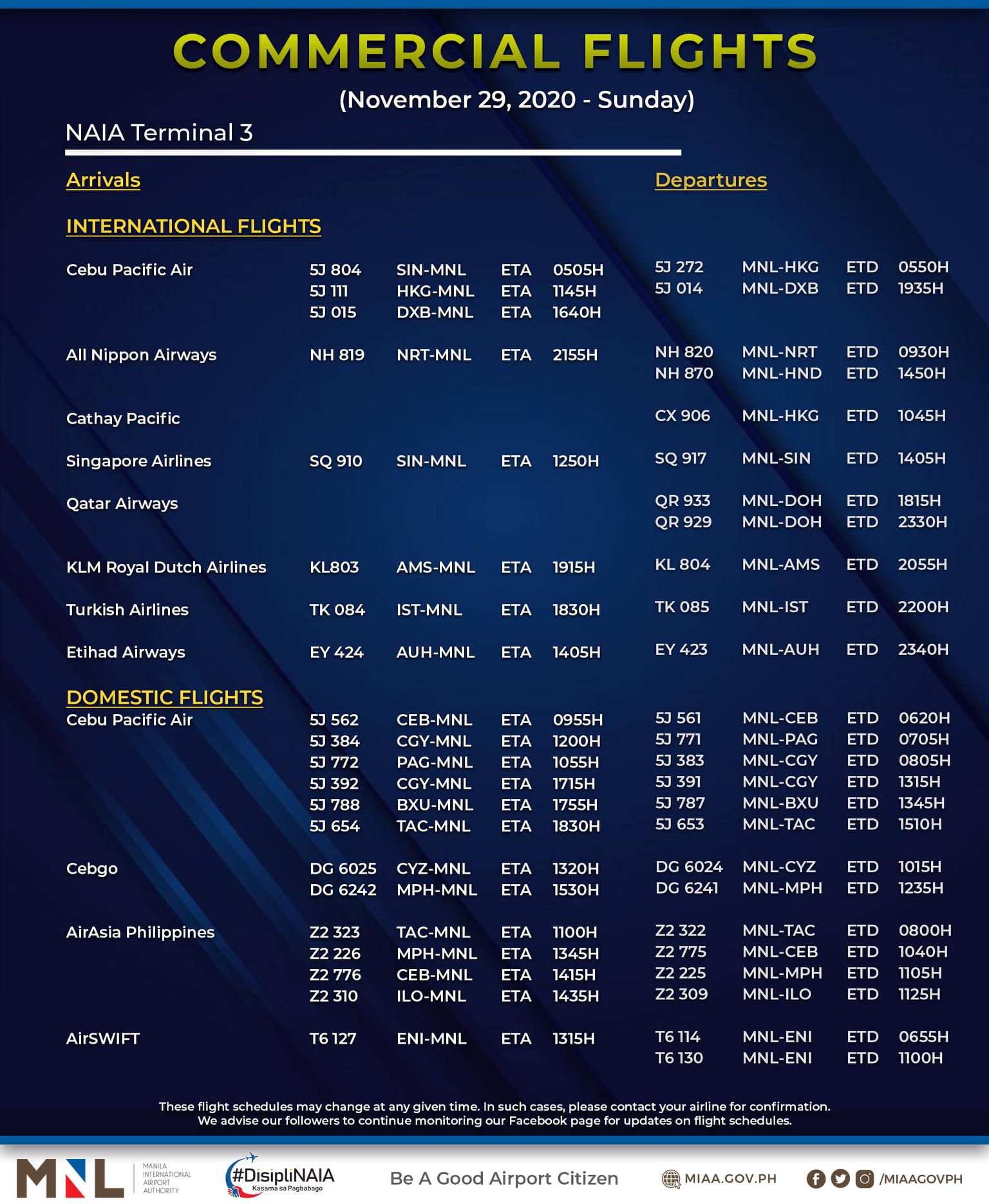 (Eagle News) — The Manila International Airport Authority has released its list of operational commercial flights for Sunday, Nov. 29: