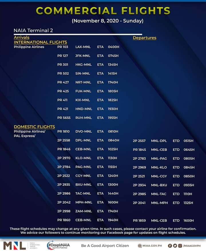 (Eagle News)–The Manila International Airport Authority has released its list of operational commercial flights for Sunday, Nov. 8:
