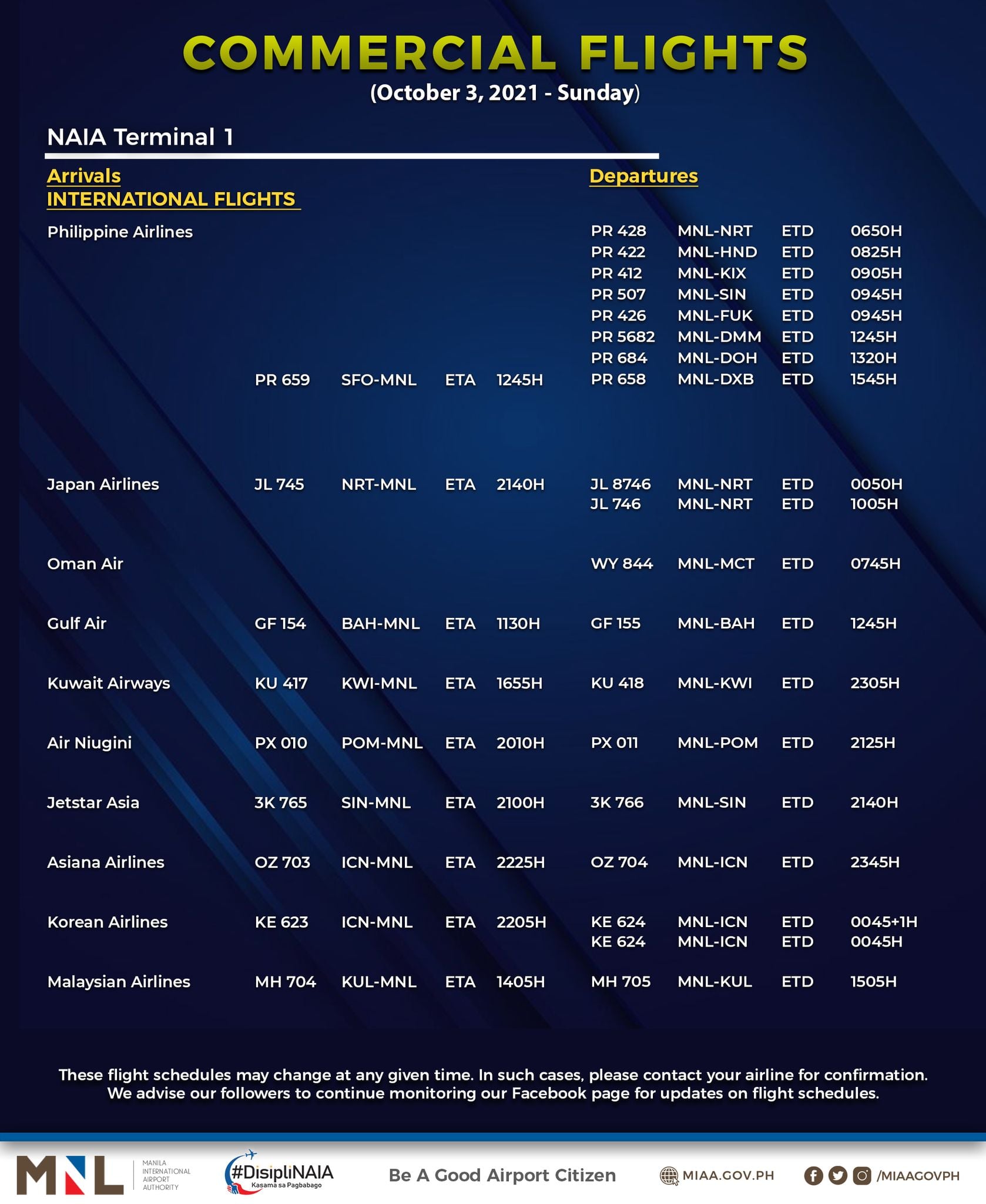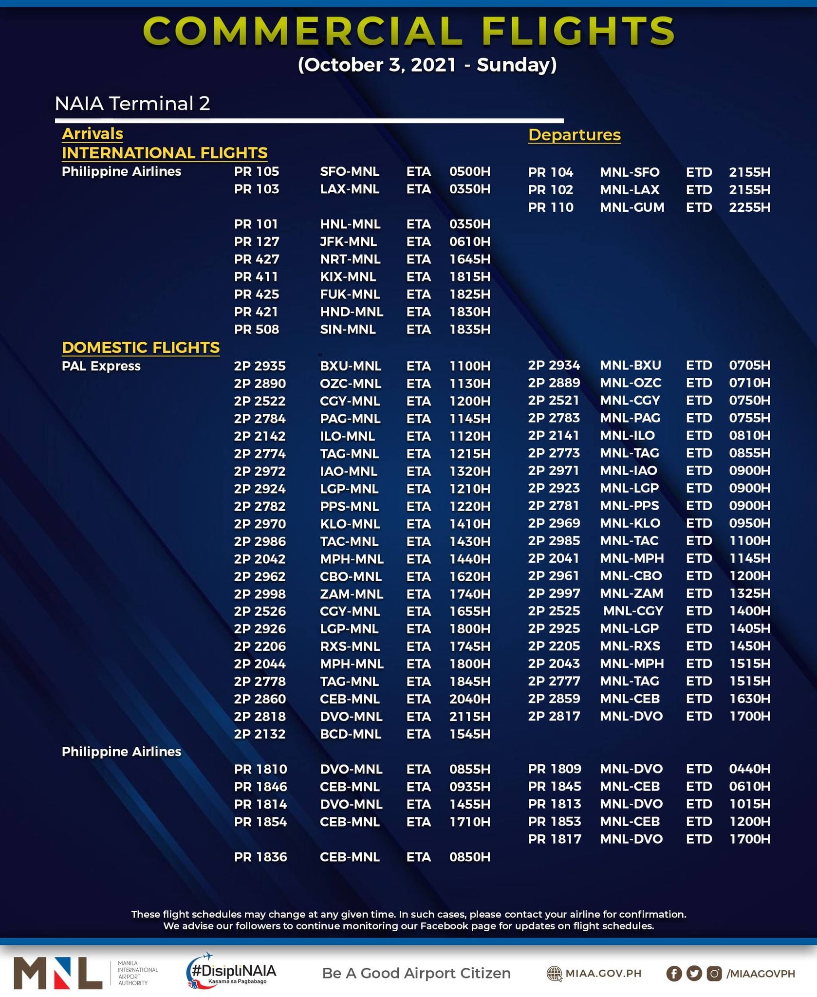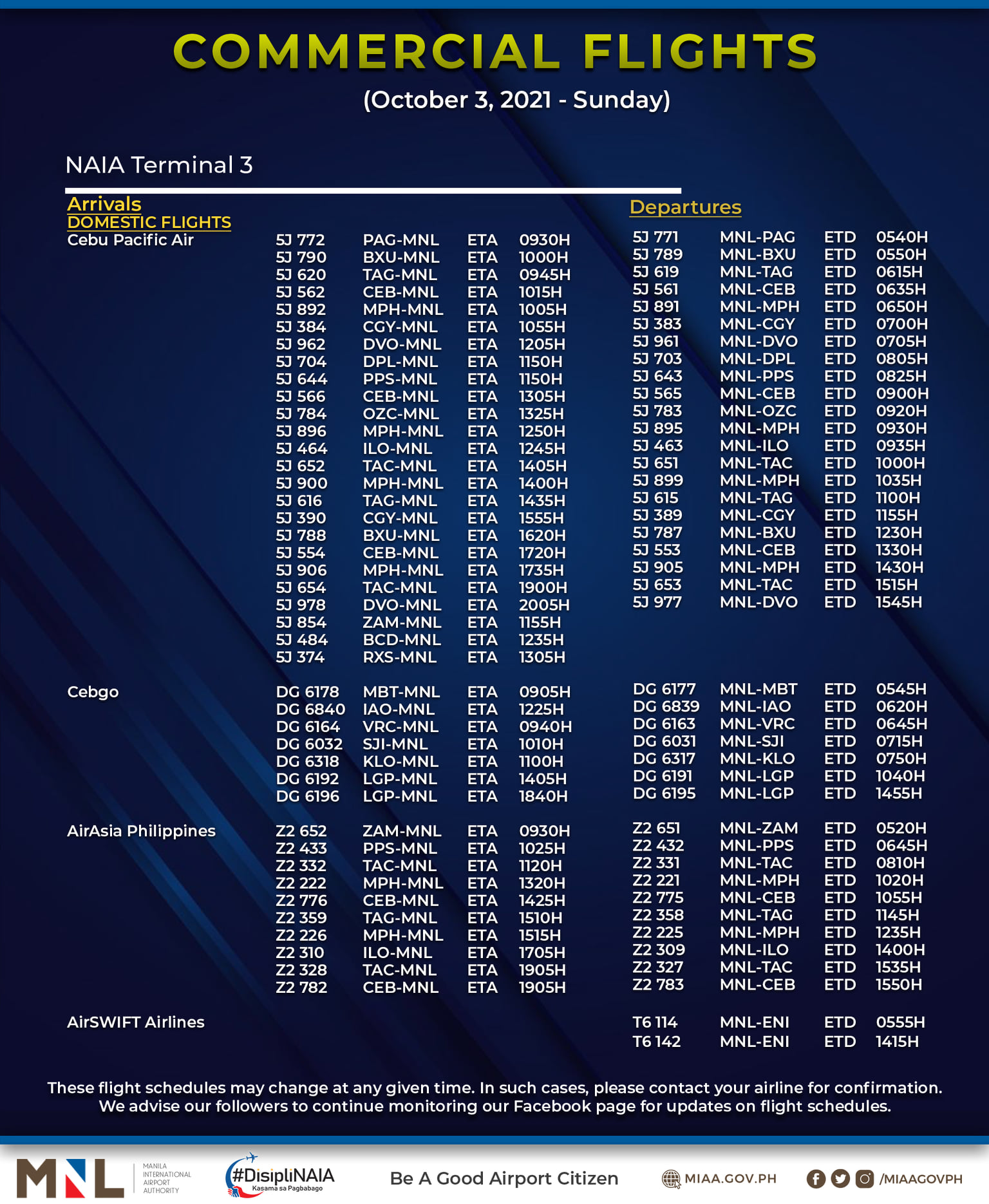(Eagle News) — The Manila International Airport Authority has released its list of operational commercial flights for Sunday, Oct. 3: