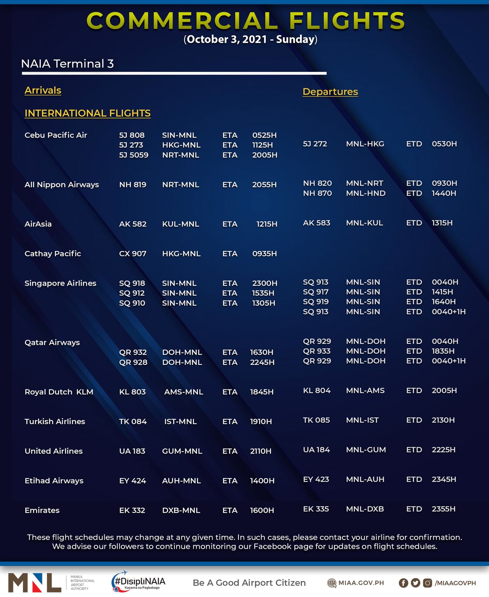 (Eagle News) — The Manila International Airport Authority has released its list of operational commercial flights for Sunday, Oct. 3: