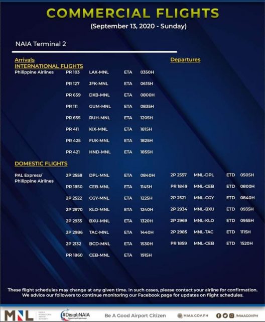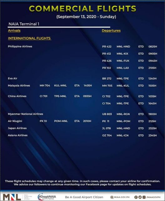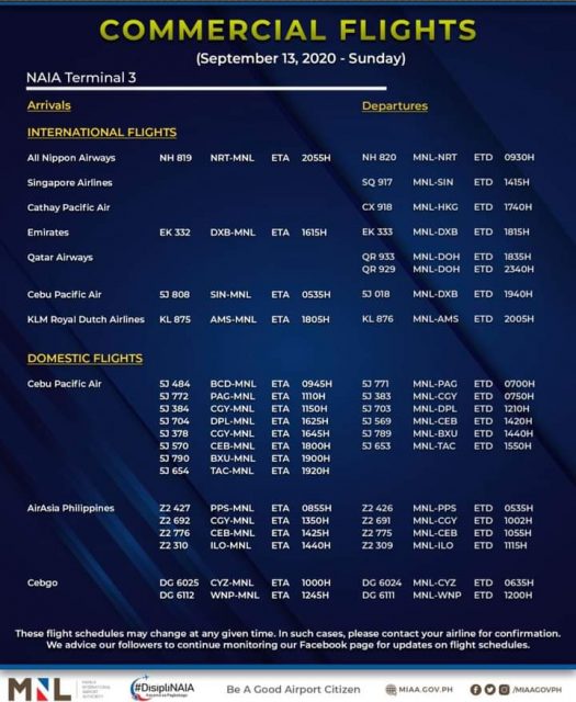 (Eagle News)–The Manila International Airport Authority has released its list of operational commercial flights for Sunday, Sept. 13:
