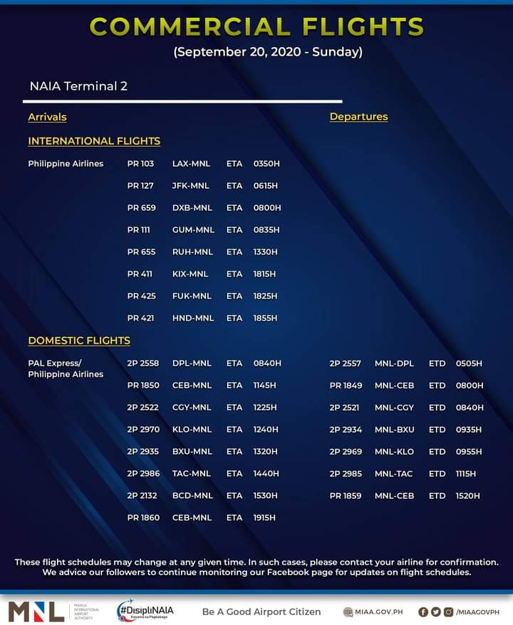 (Eagle News)–The Manila International Airport Authority has released its list of operational commercial flights for Sunday, Sept. 20: