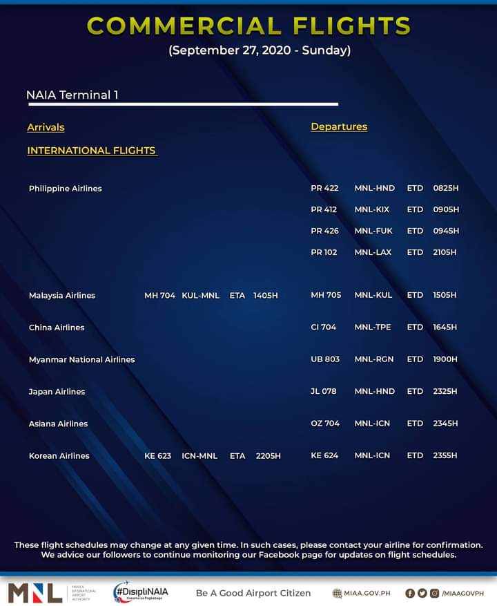 (Eagle News)–The Manila International Airport Authority has released its list of operational commercial flights for Sunday, Sept. 27: