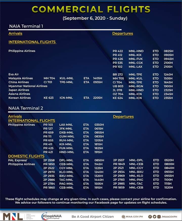 (Eagle News)–The Manila International Airport Authority has released its list of operational commercial flights for Sunday, Sept. 6:
