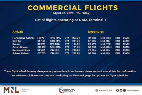 MIAA earlier said all flights are now concentrated in the Ninoy Aquino International Airport Terminal 1 in a bid to reduce the risk of exposure of airport workers to the virus that causes the coronavirus disease 2019.