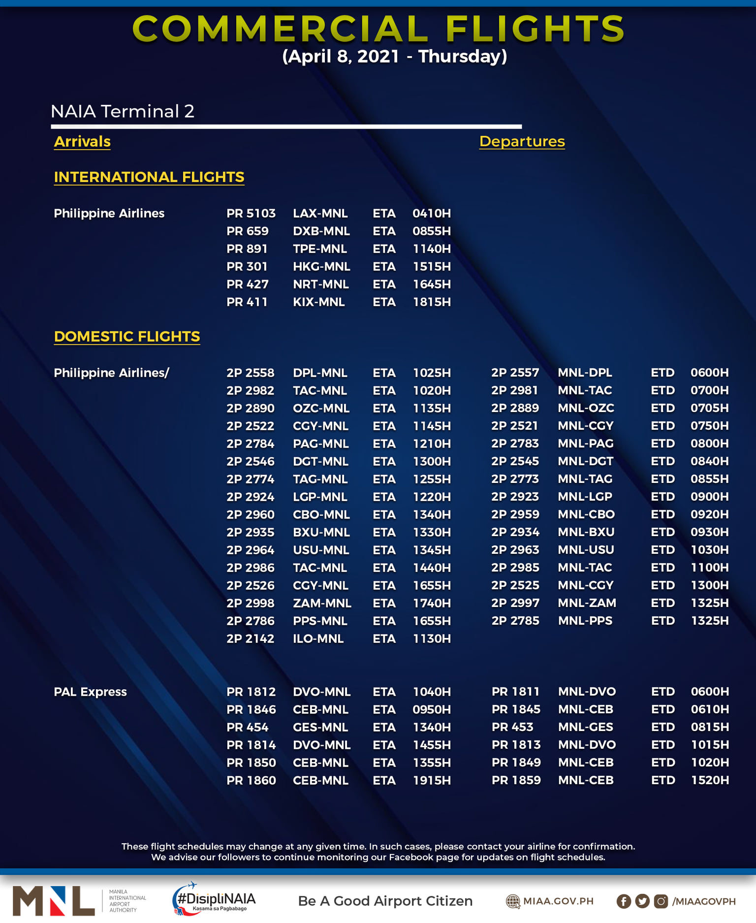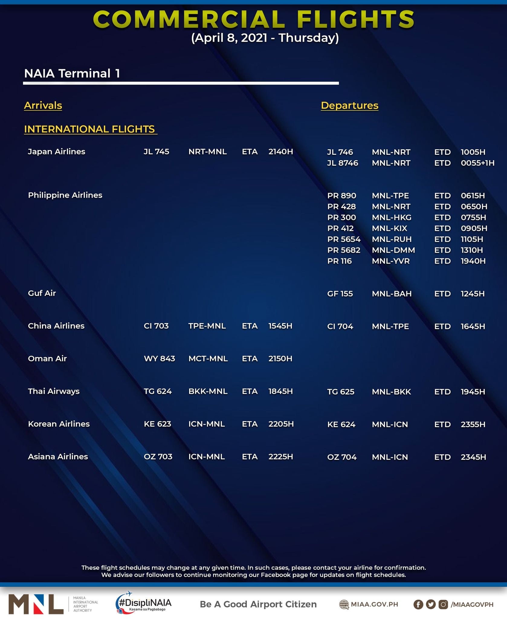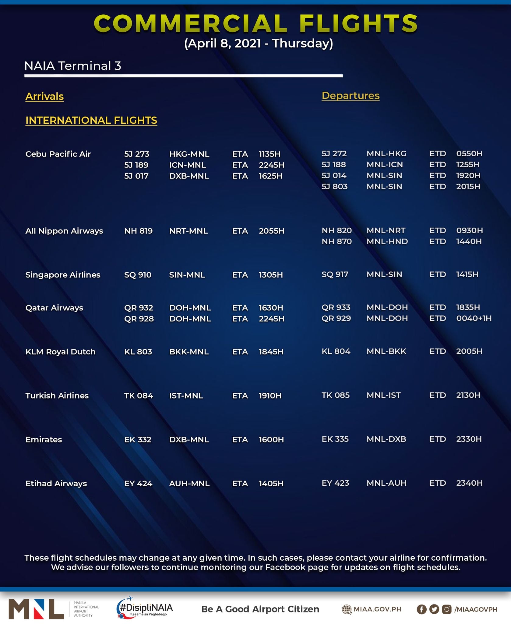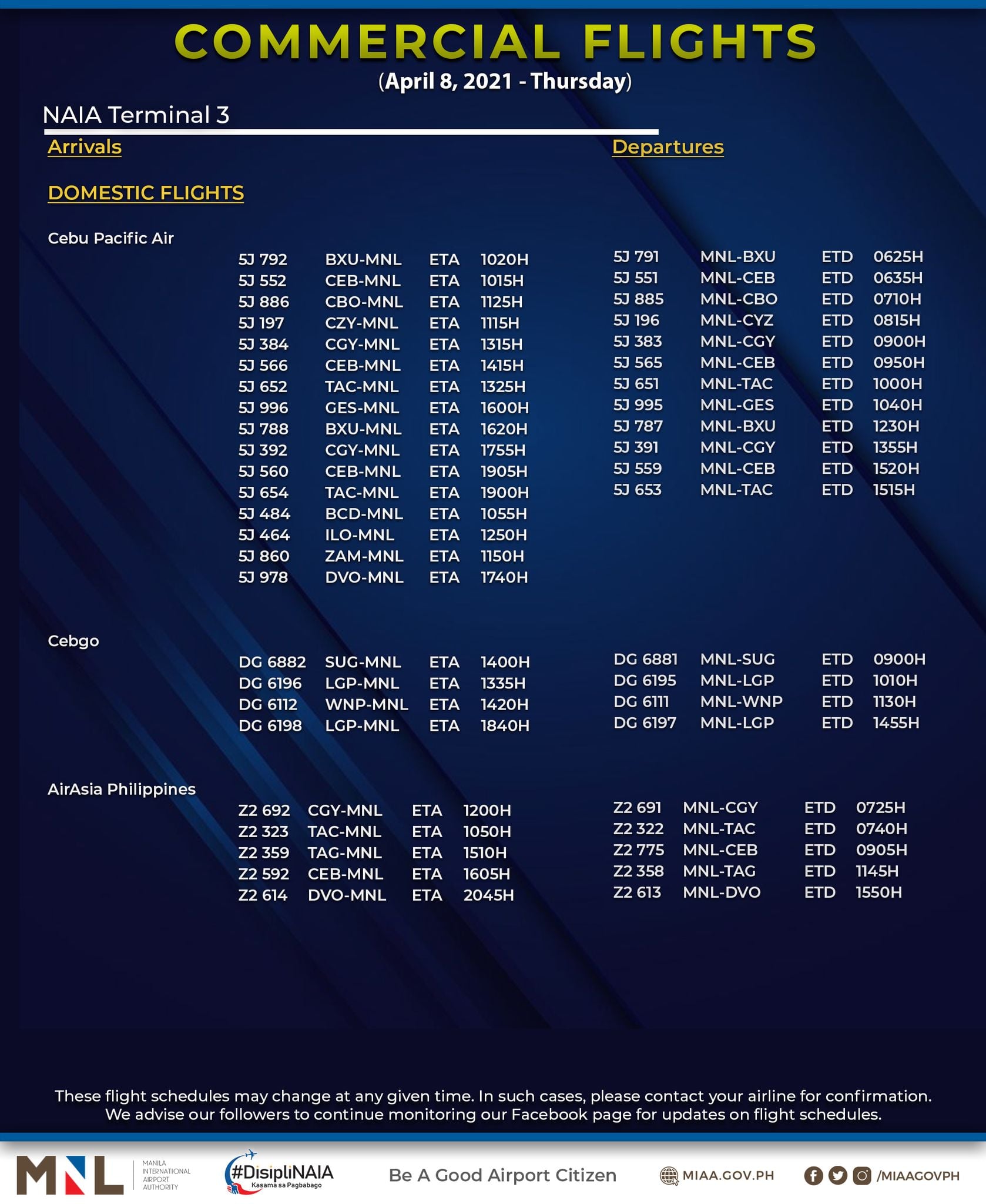 (Eagle News) — The Manila International Airport Authority has released its list of operational commercial flights for Thursday, April 8: