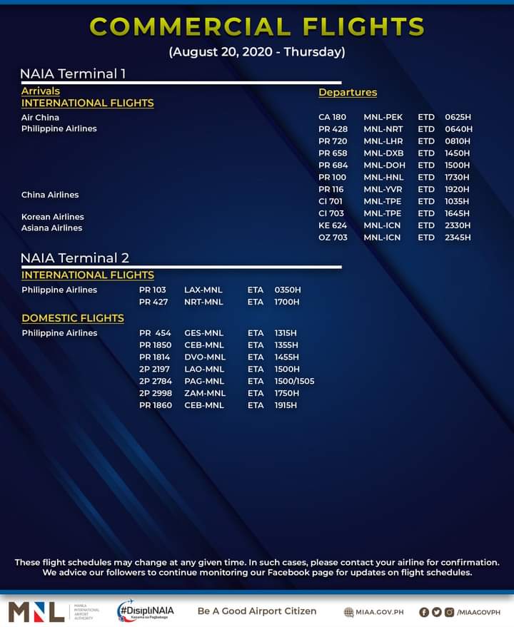 (Eagle News)–The Manila International Airport Authority has released its list of operational commercial flights for Thursday, Aug. 20: