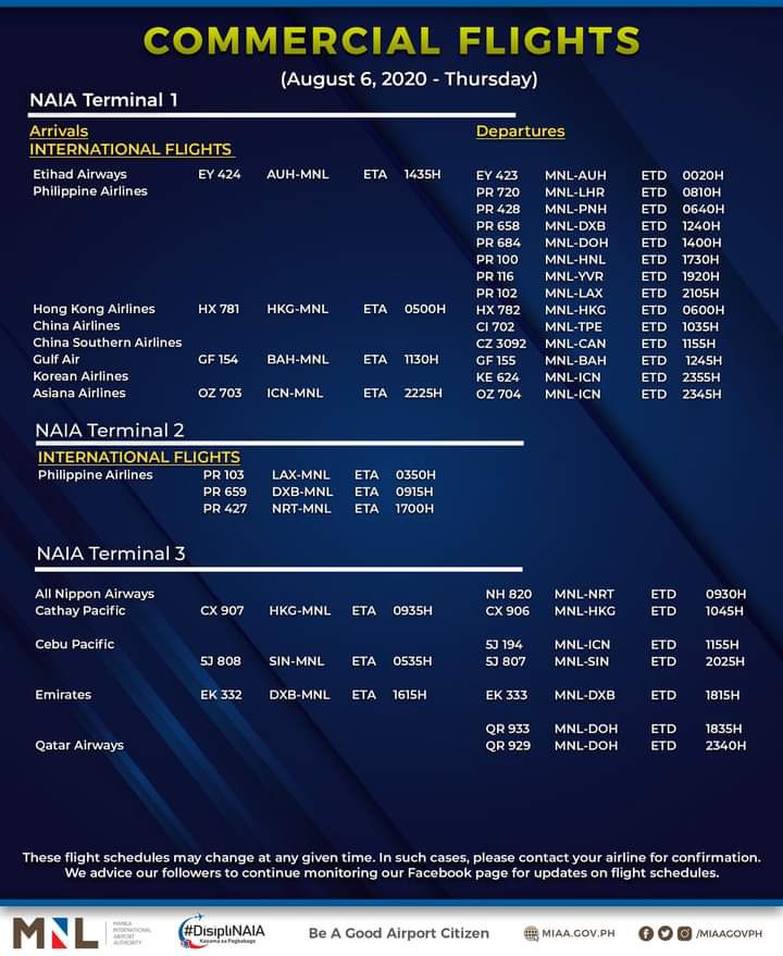 (Eagle News) — The Manila International Airport Authority has released its list of operational commercial flights for Thursday, Aug. 6:
