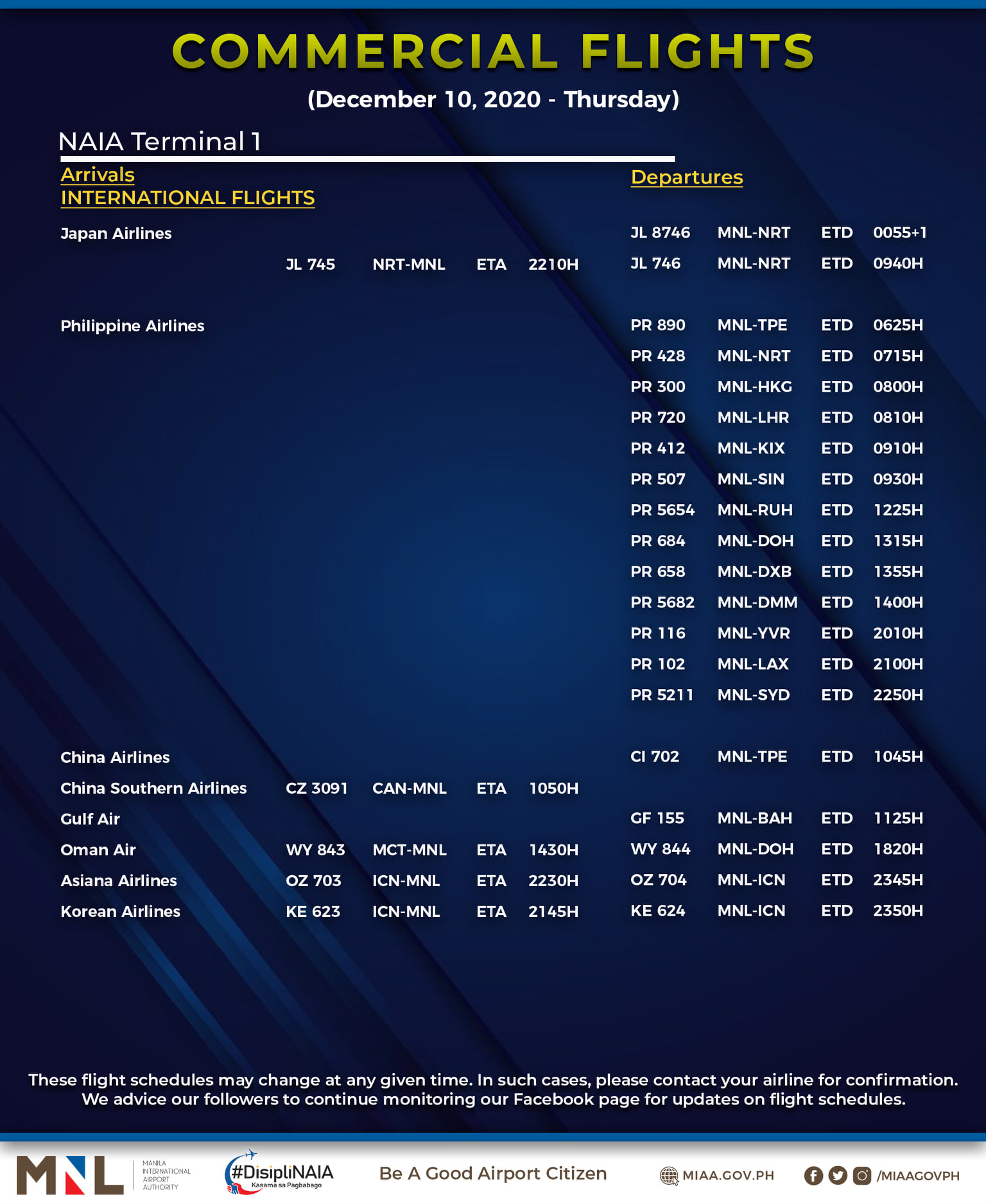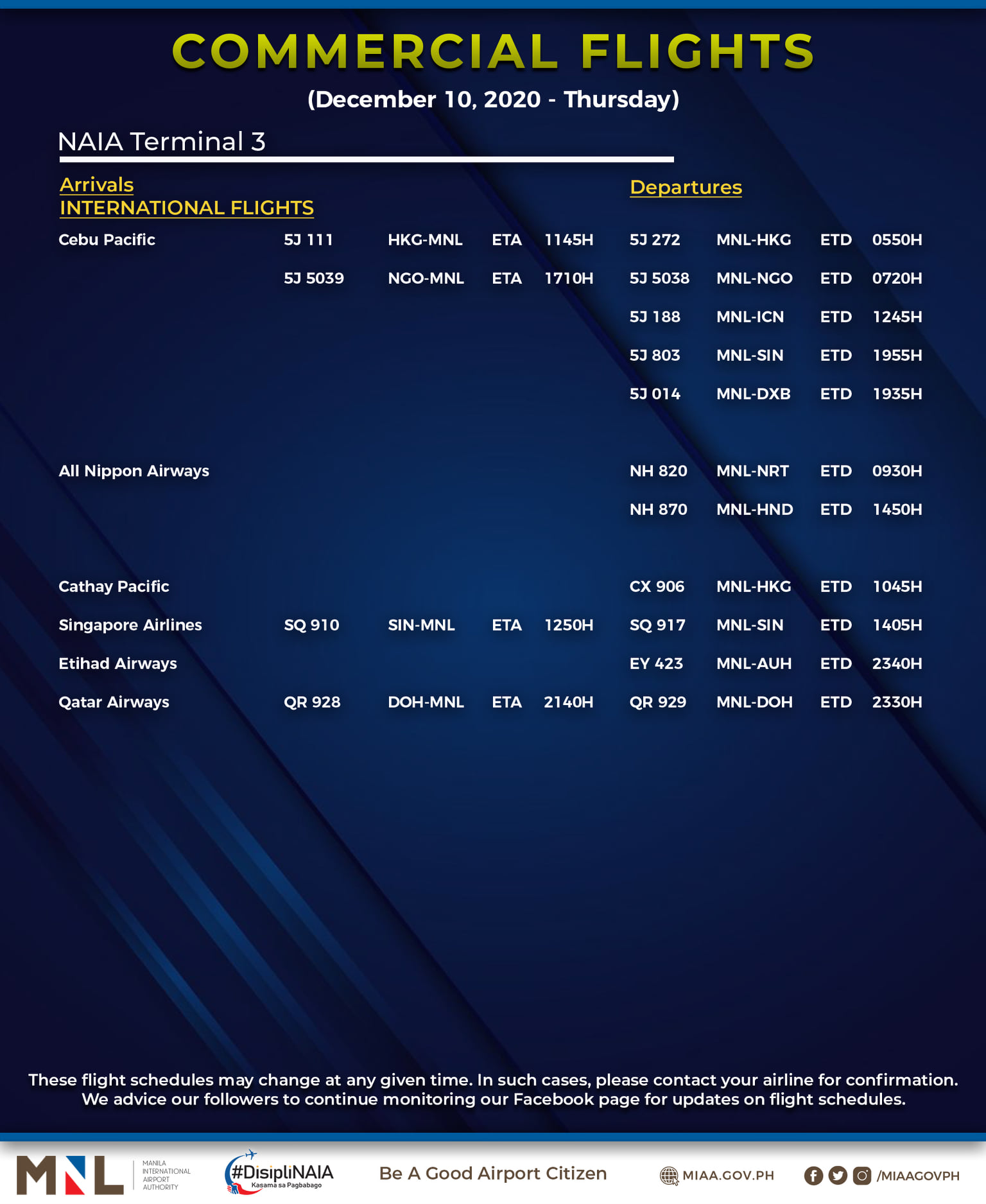 (Eagle News) — The Manila International Airport Authority has released its list of operational commercial flights for Thursday, Dec. 10: