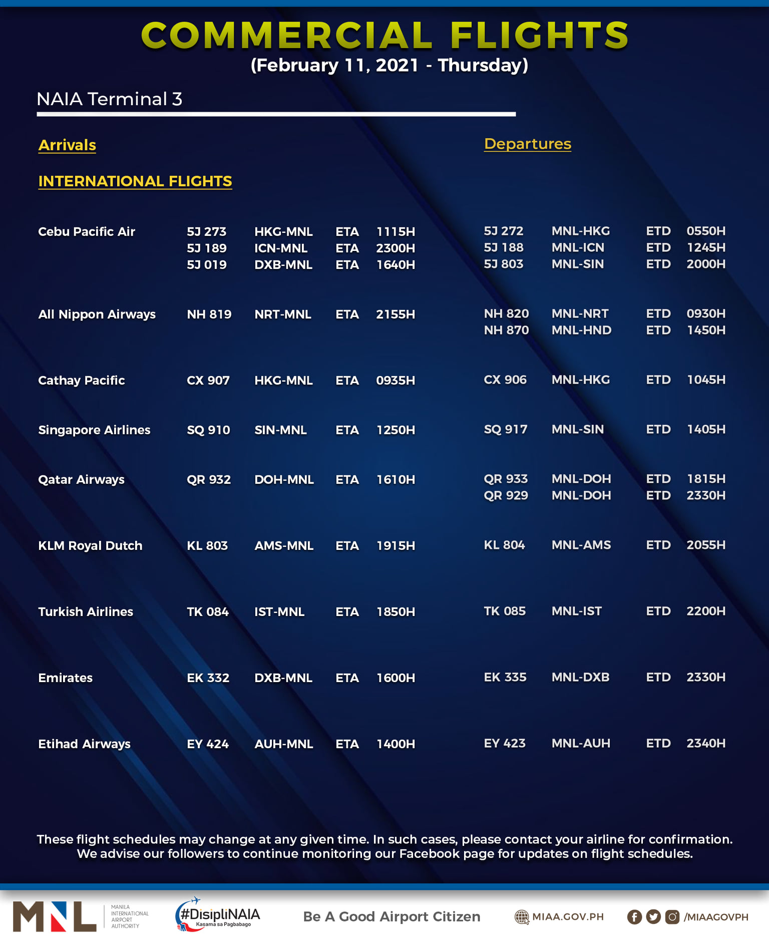 (Eagle News) — The Manila International Airport Authority has released its list of operational commercial flights for Thursday, Feb. 11: