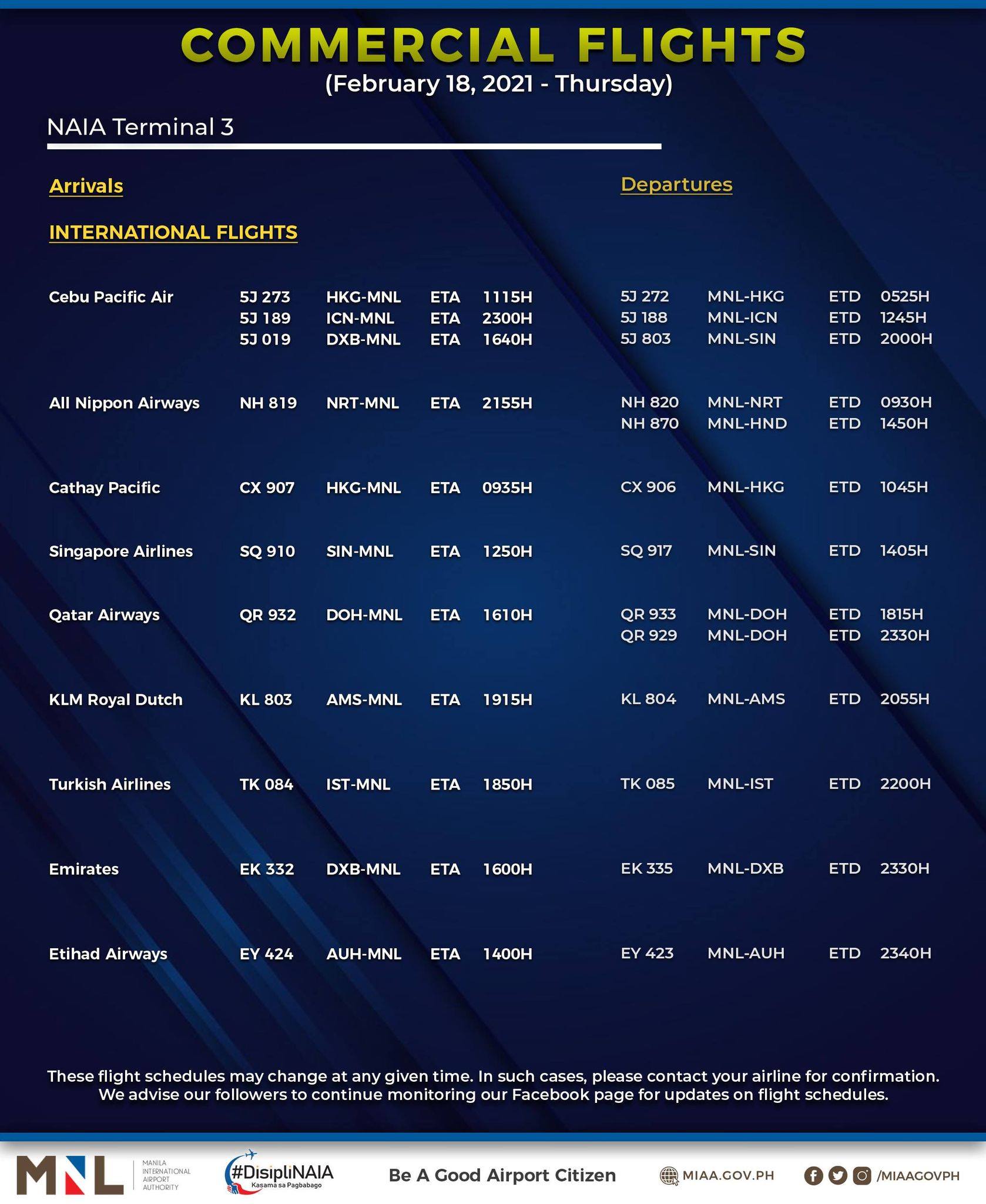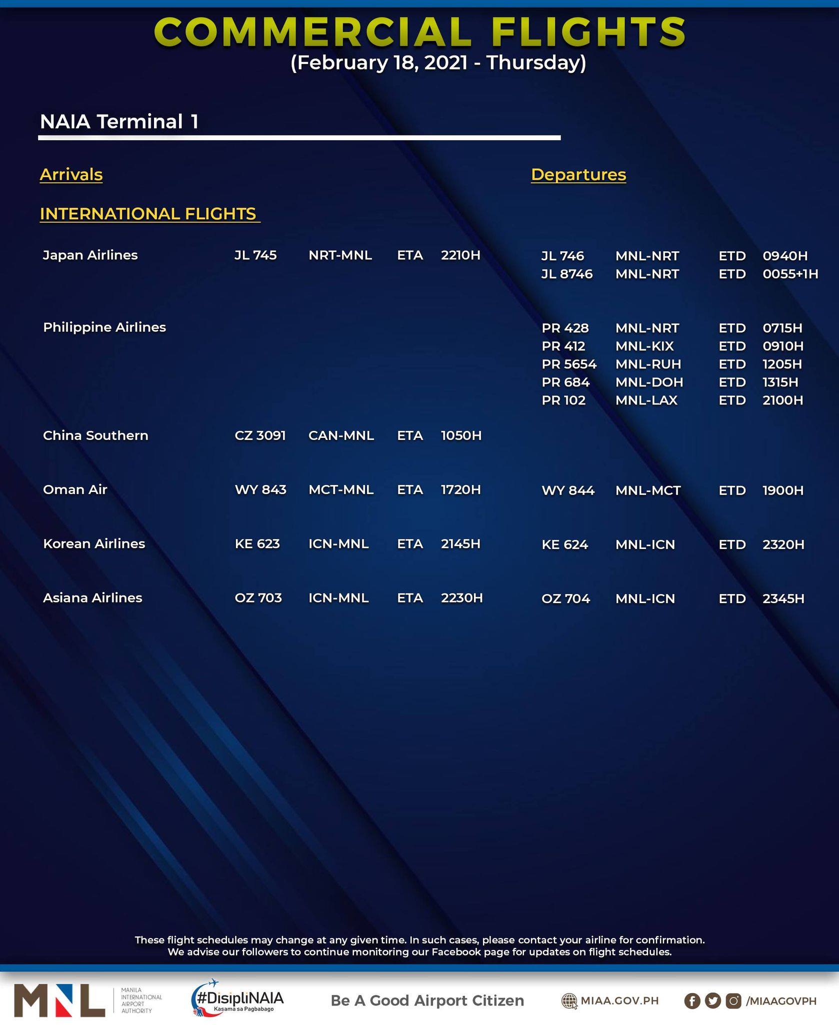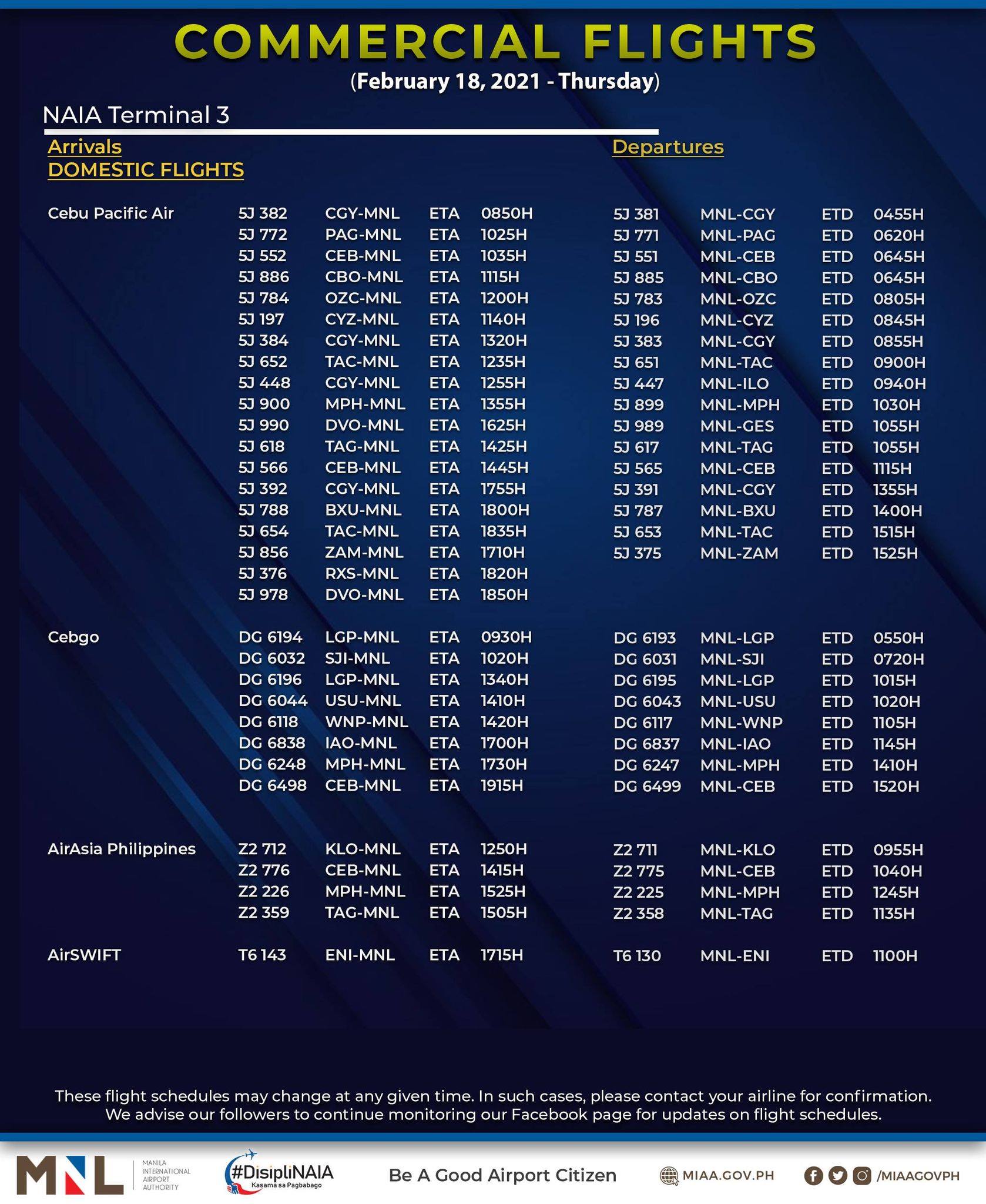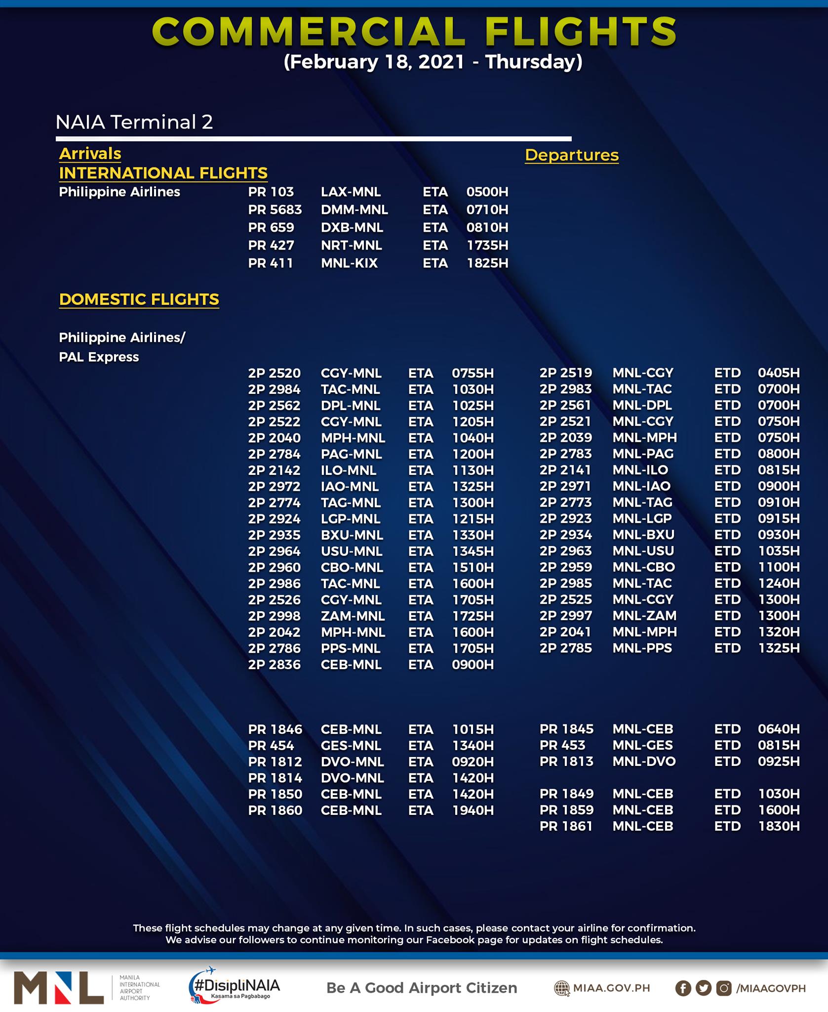 (Eagle News) — The Manila International Airport Authority has released its list of operational commercial flights for Thursday, Feb. 18: