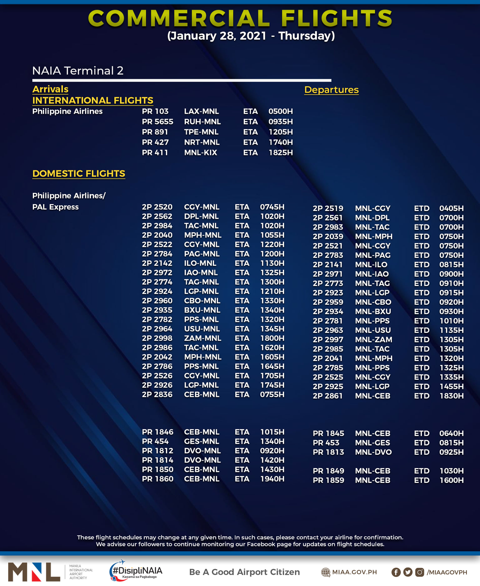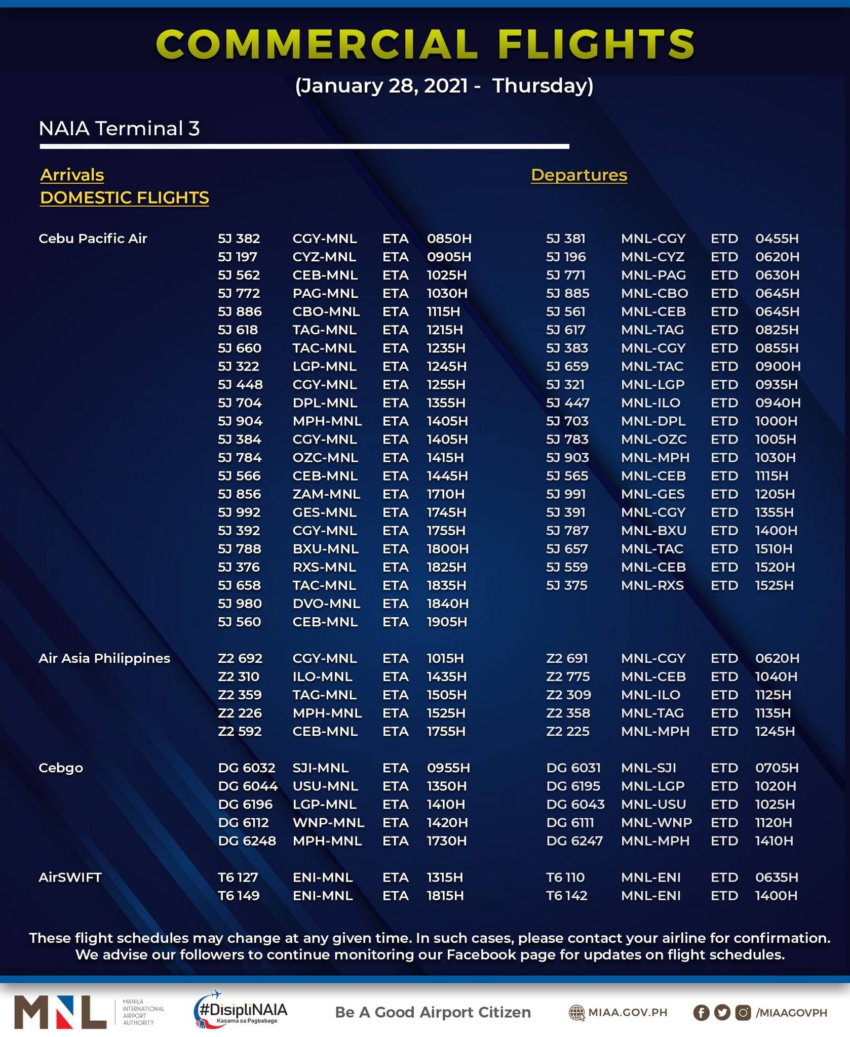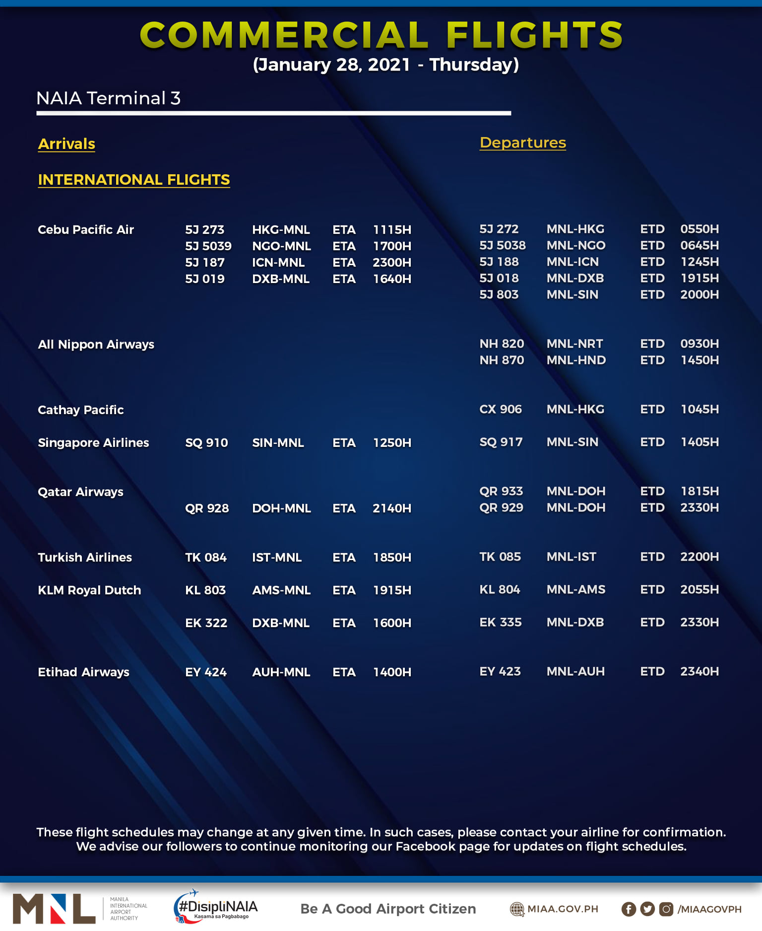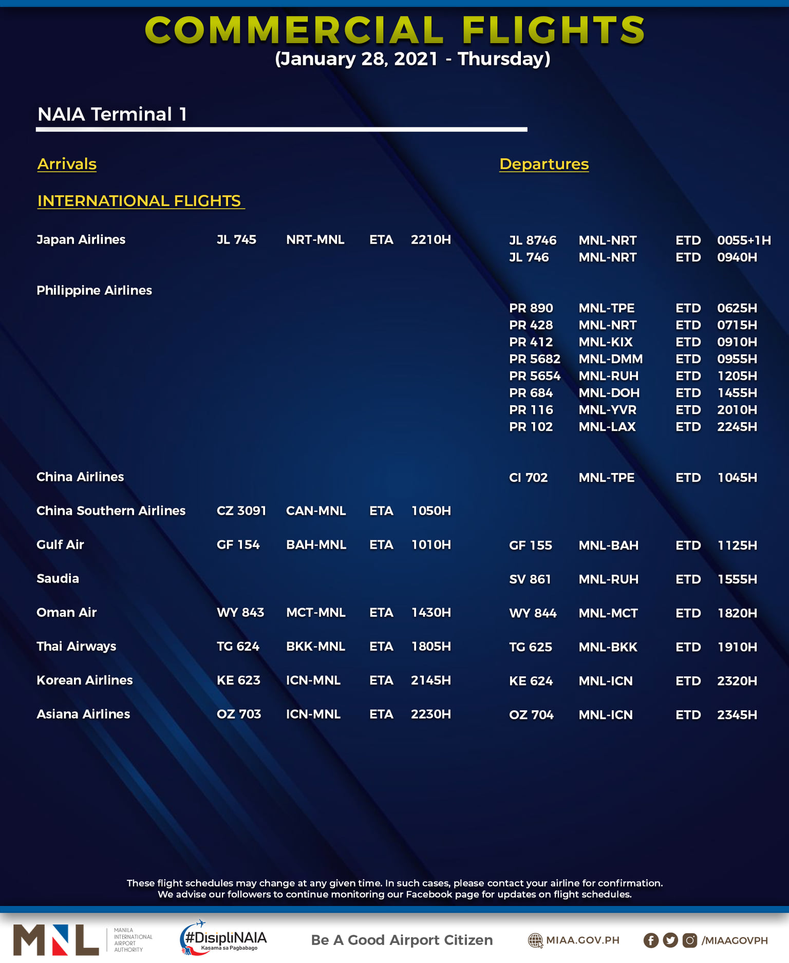 (Eagle News) — The Manila International Airport Authority has released its list of operational commercial flights for Thursday, Jan. 28: