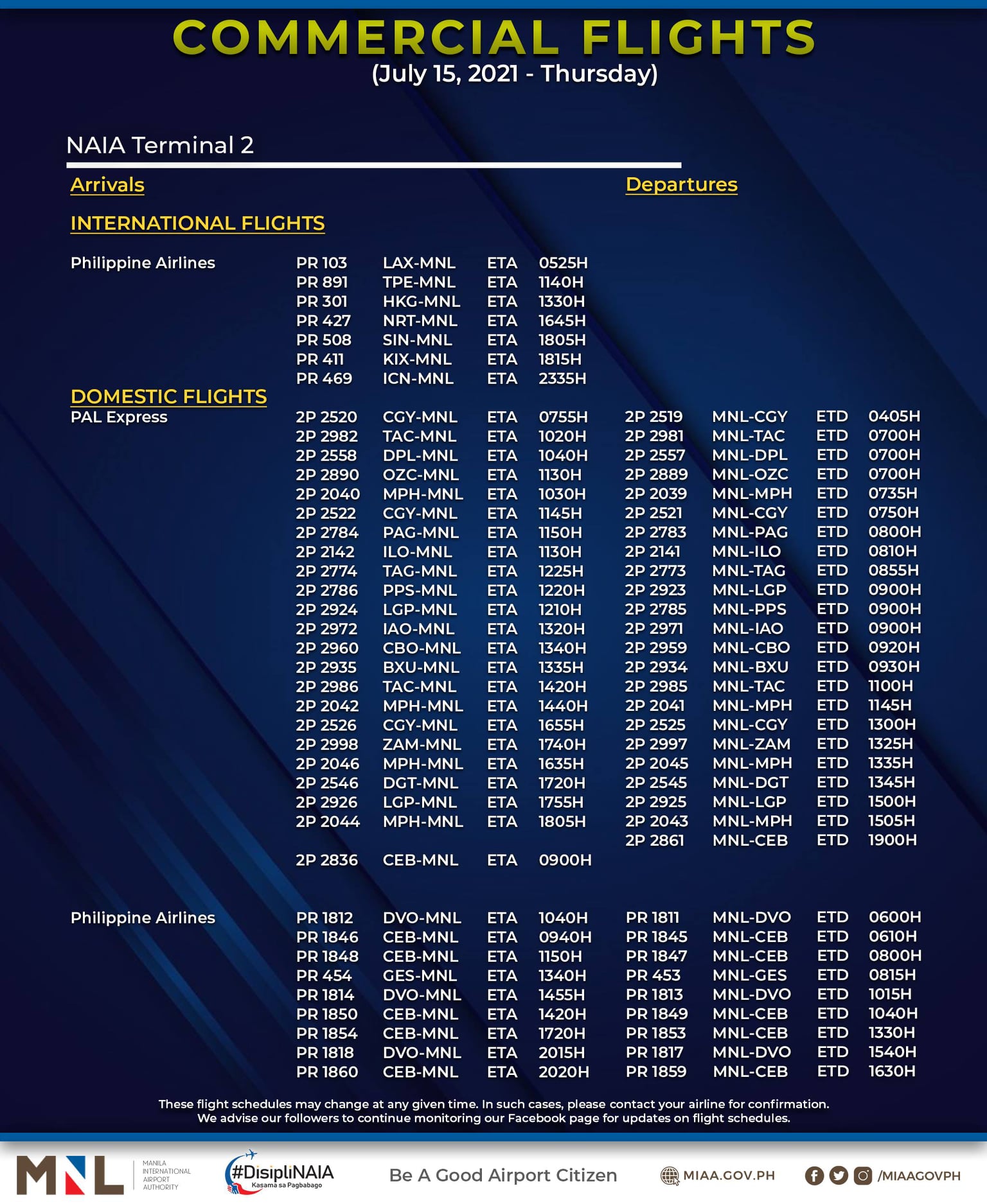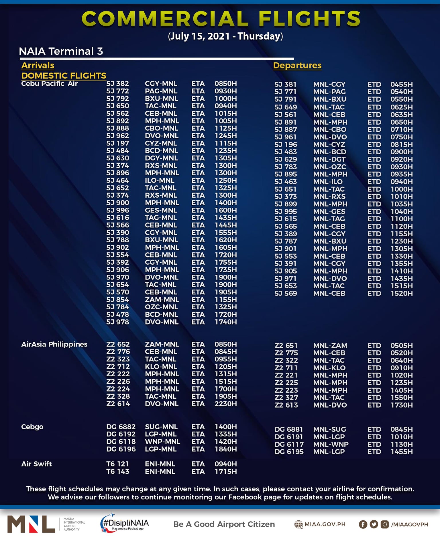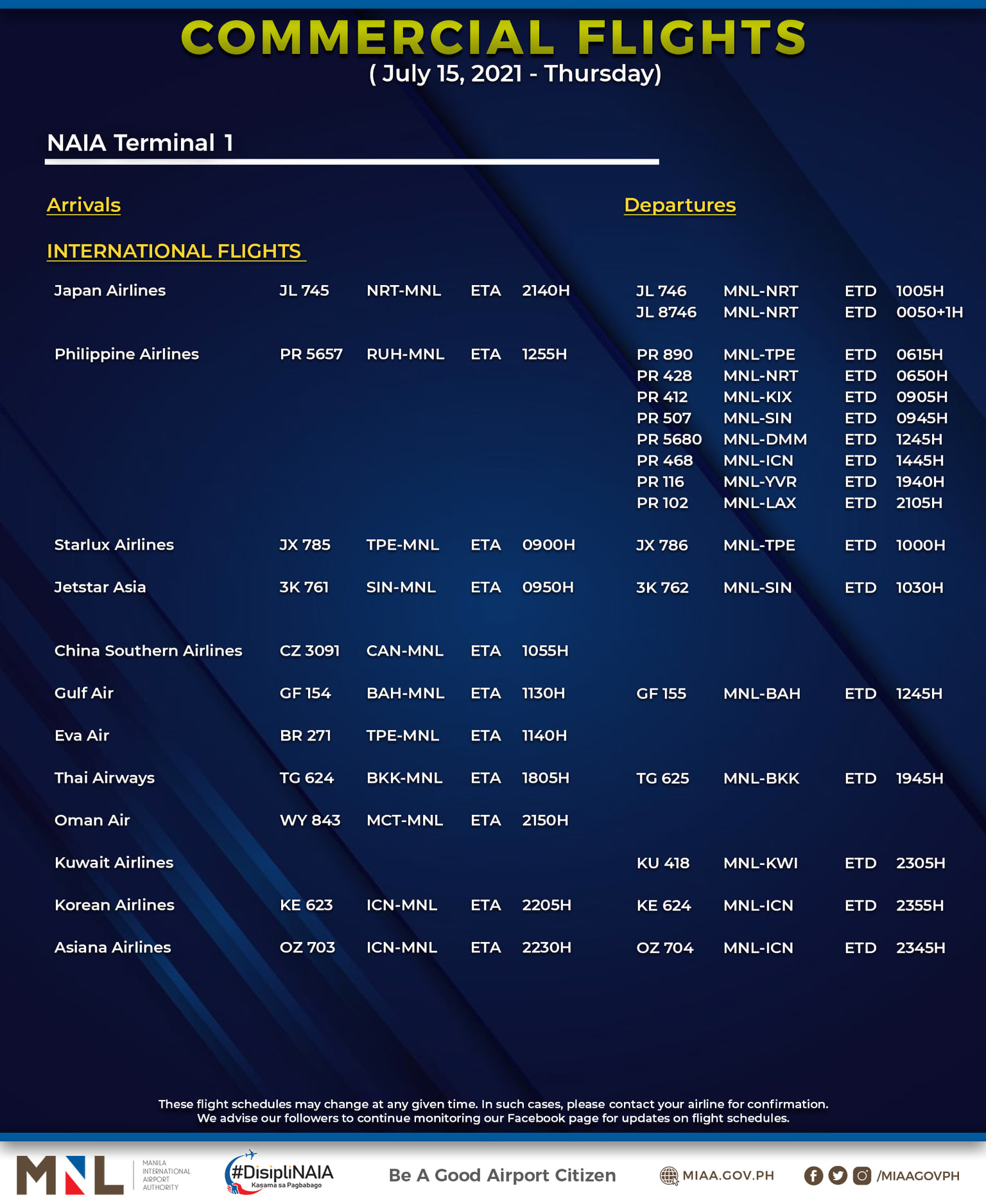 (Eagle News) — The Manila International Airport Authority has released its list of operational commercial flights for Thursday, July 15: