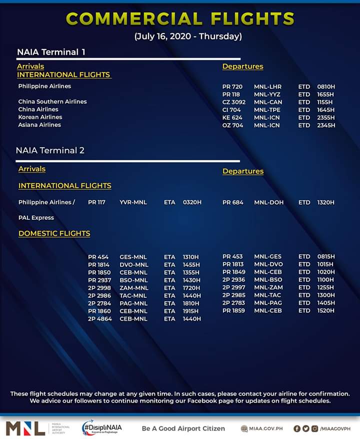 (Eagle News)–The Manila International Airport Authority has released its list of operational commercial flights for Thursday, July 16: