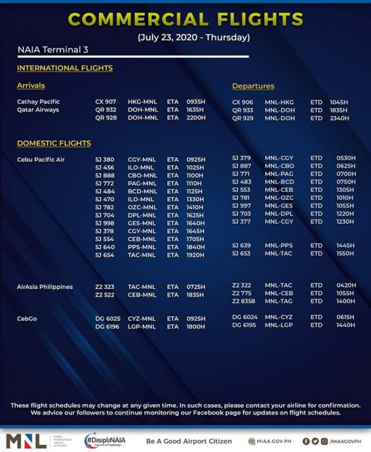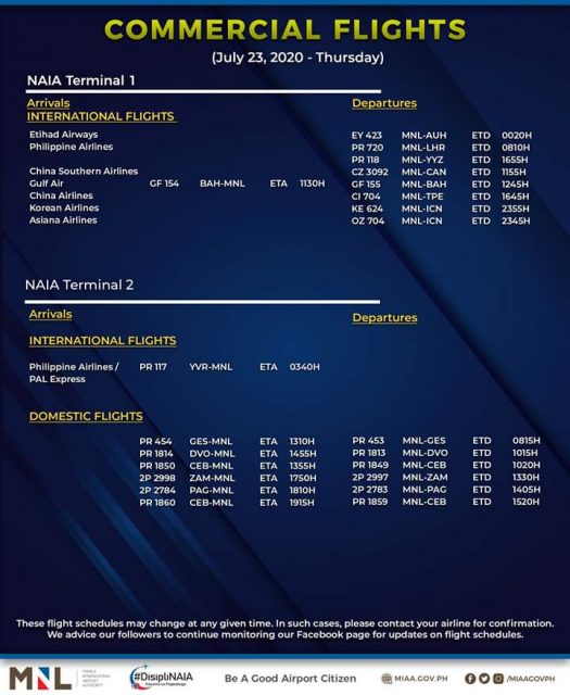 (Eagle News)–The Manila International Airport Authority has released its list of operational commercial flights for Thursday, July 23: