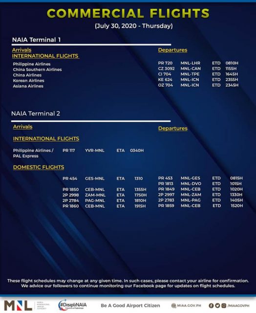 (Eagle News)–The Manila International Airport Authority has released its list of operational commercial flights for Thursday, July 30: