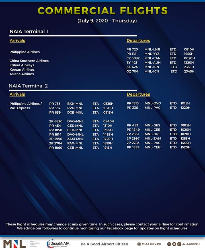 (Eagle News)–The Manila International Airport Authority has released its list of operational commercial flights for Thursday, July 9: