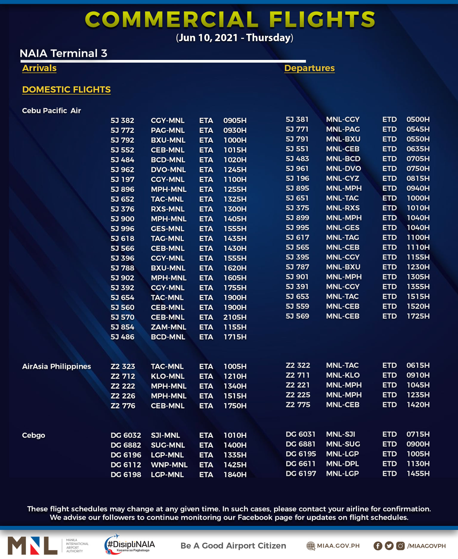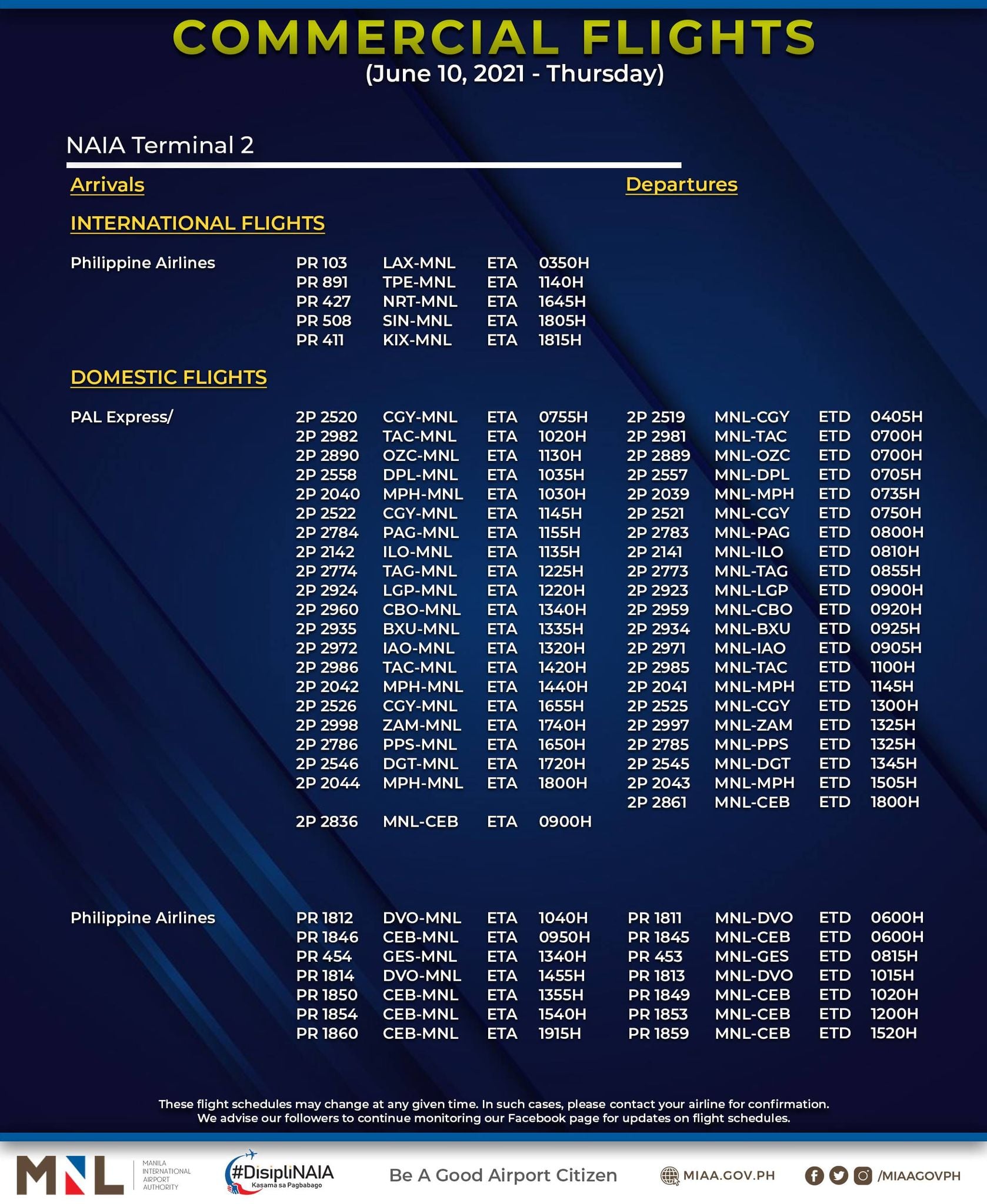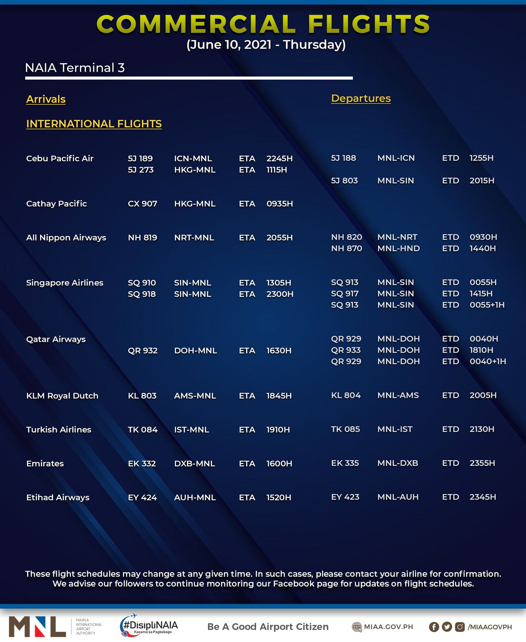 (Eagle News) — The Manila International Airport Authority has released its list of operational commercial flights for Thursday, June 10: