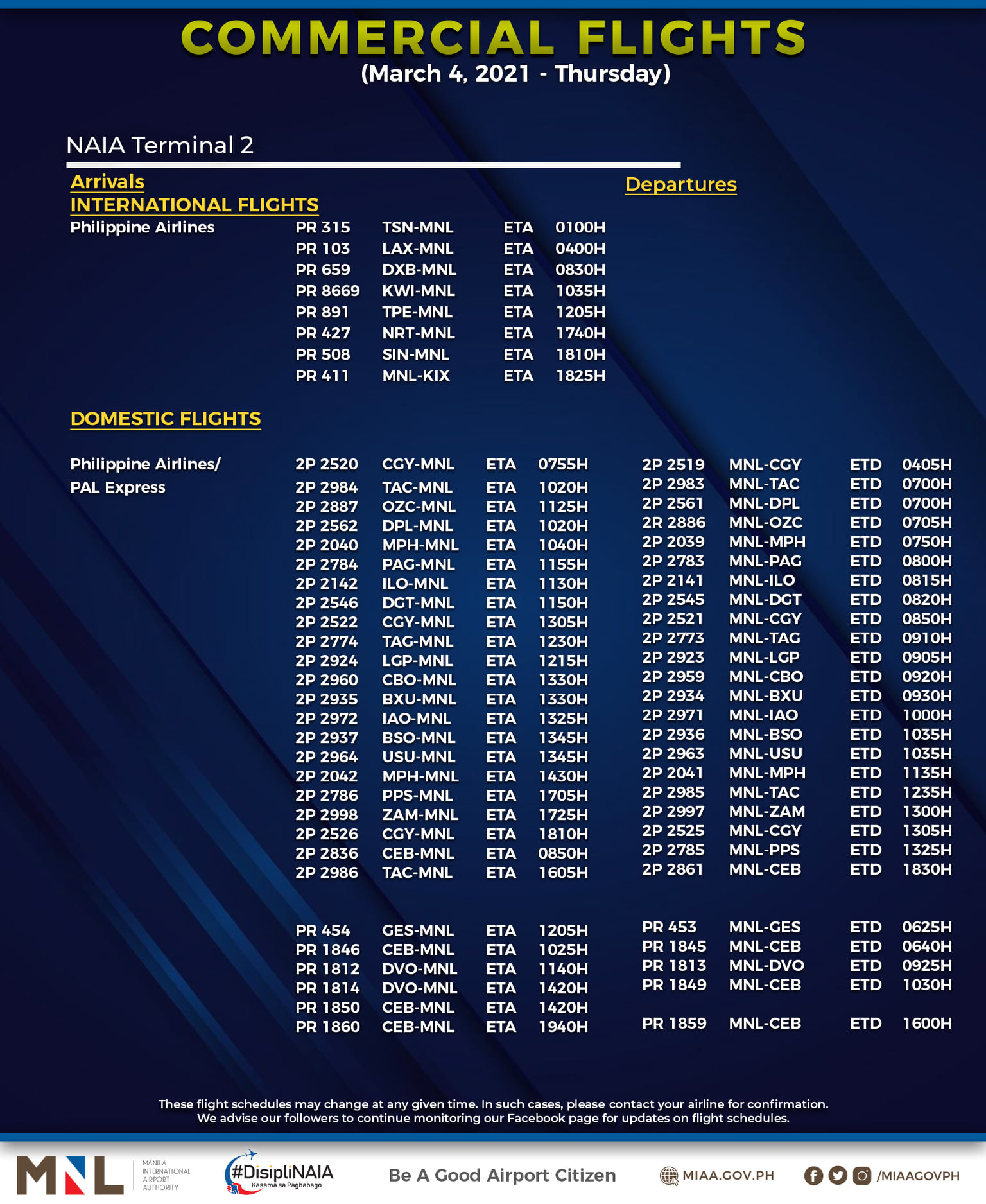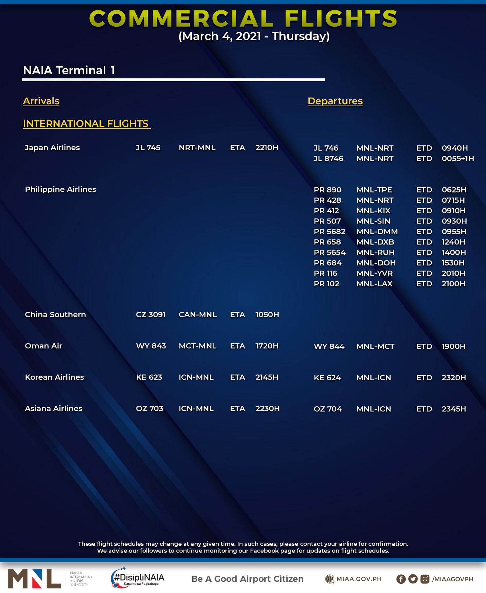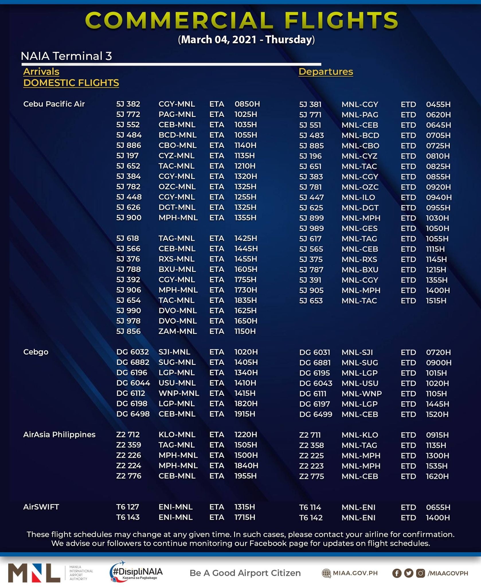 (Eagle News) — The Manila International Airport Authority has released its list of operational commercial flights for Thursday, March 4: