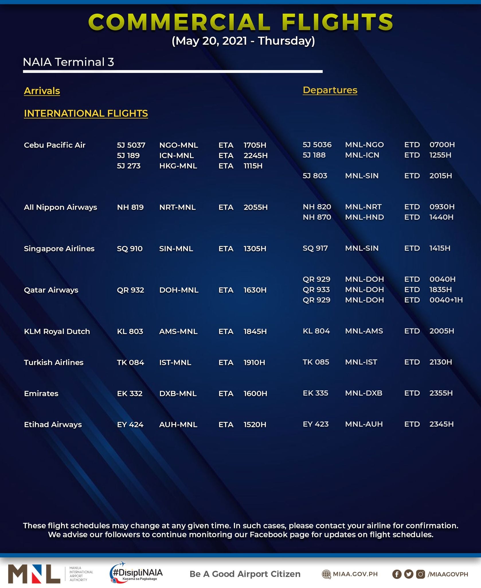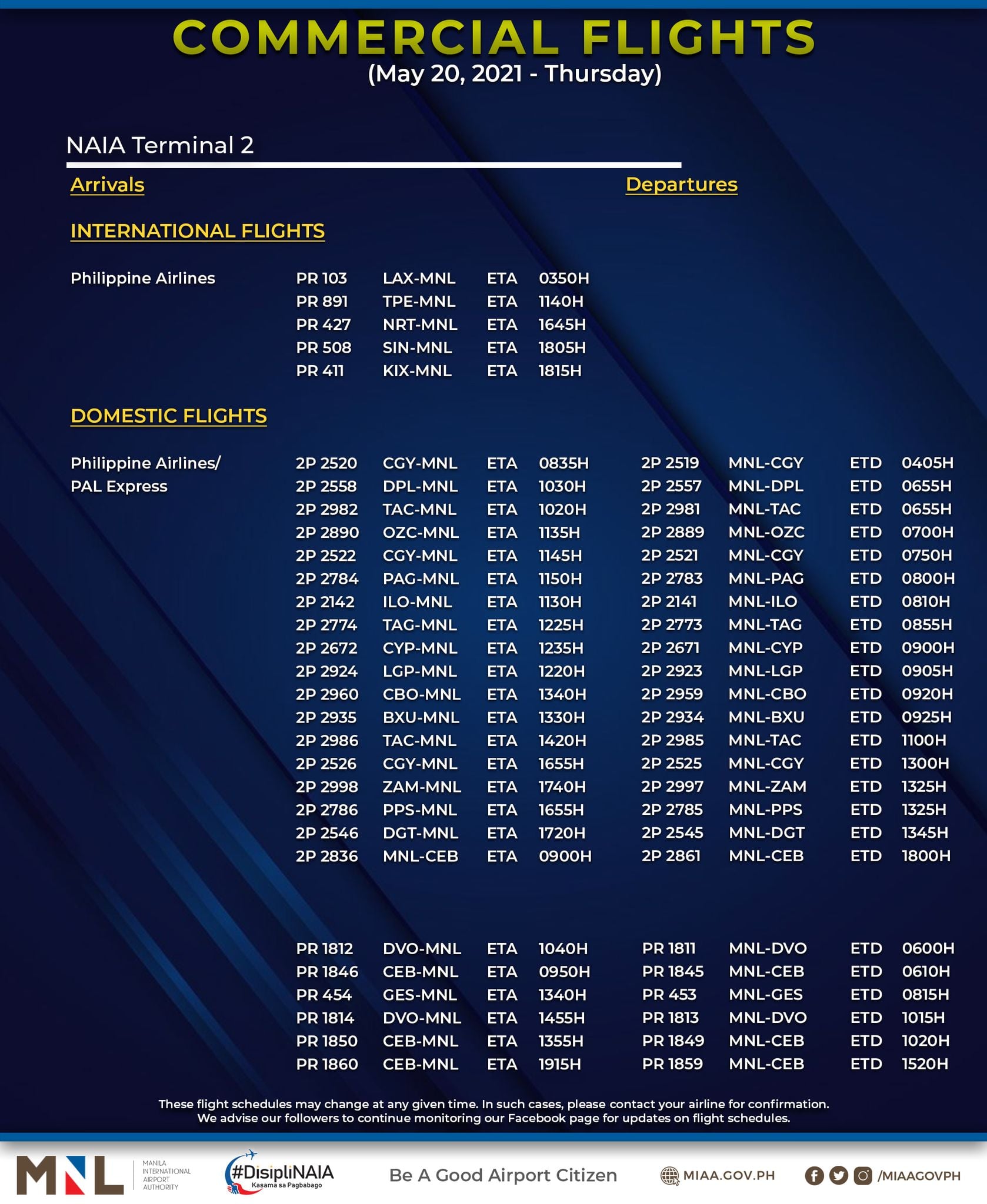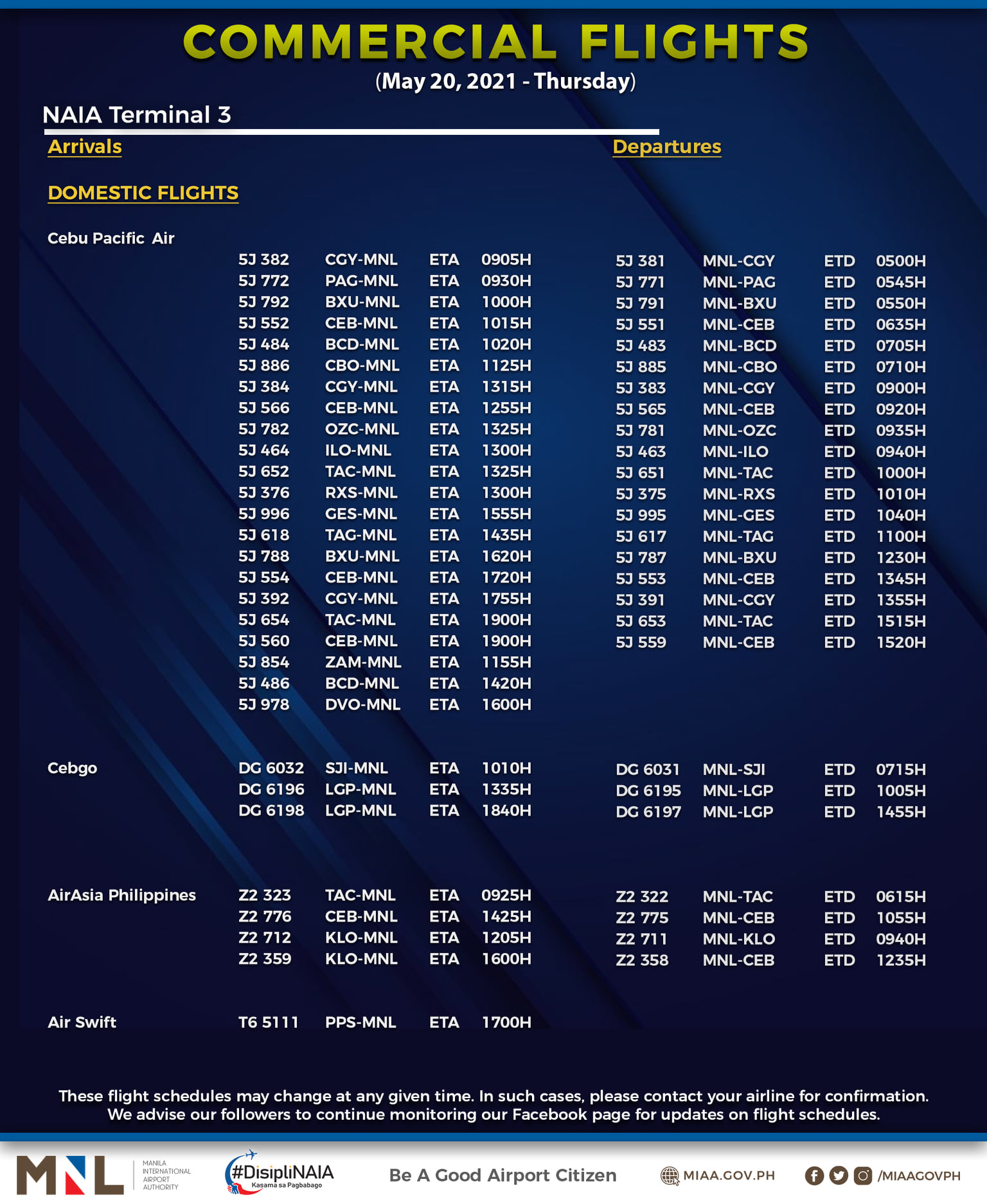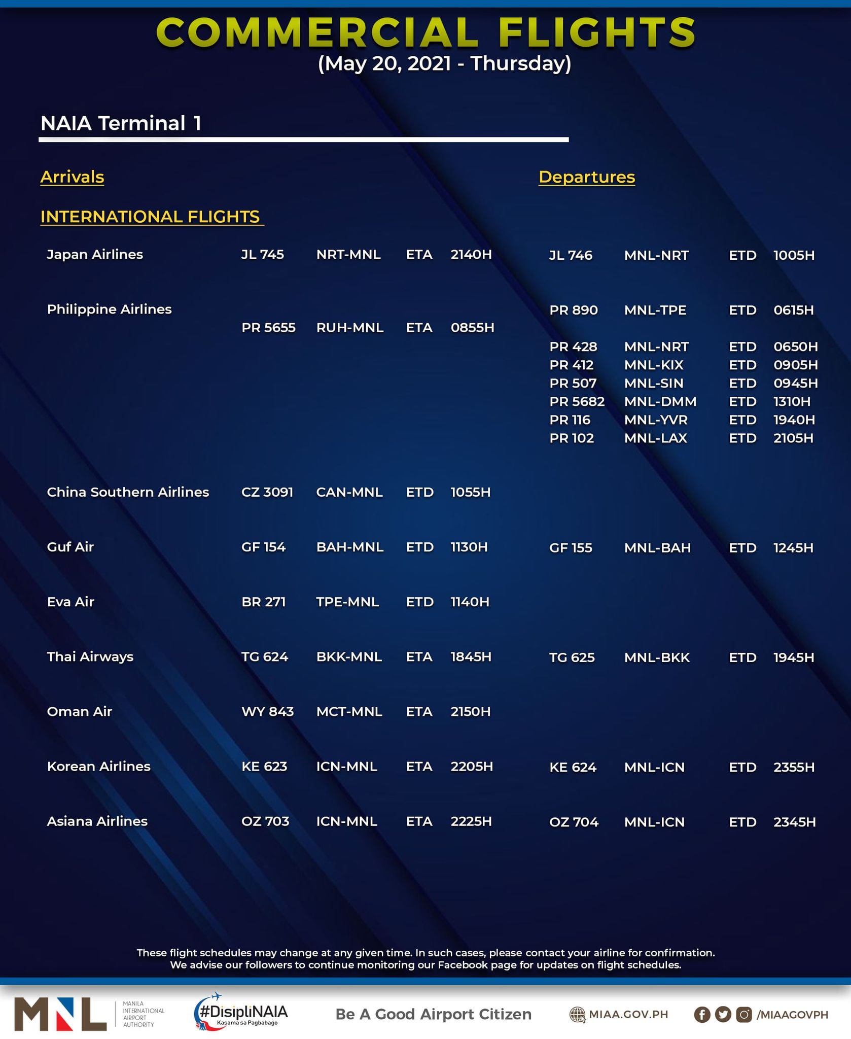 (Eagle News) — The Manila International Airport Authority has released its list of operational commercial flights for Thursday, May 20: