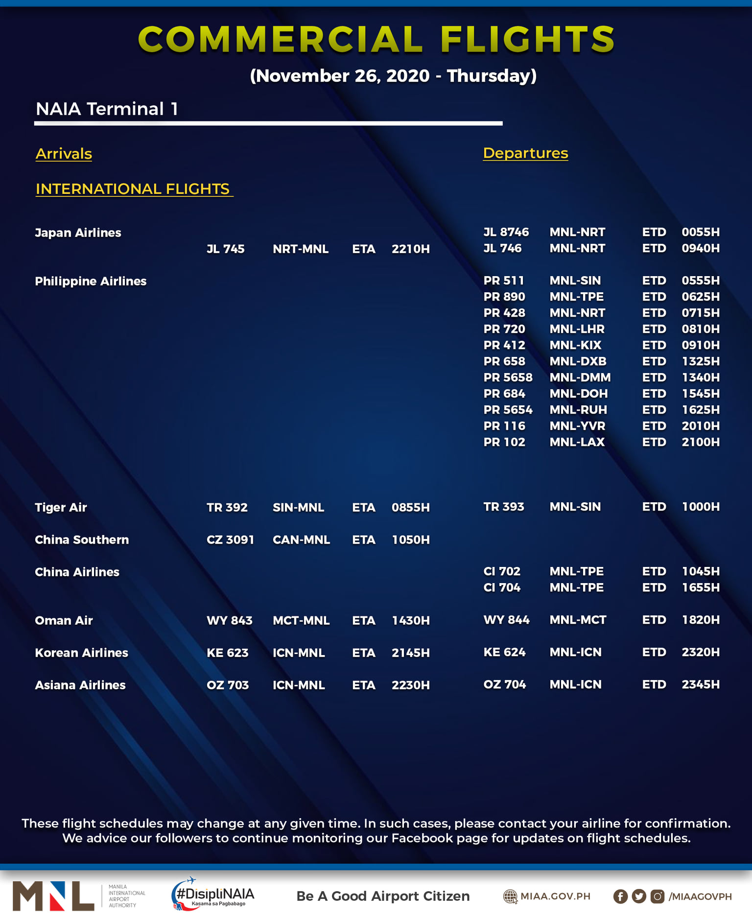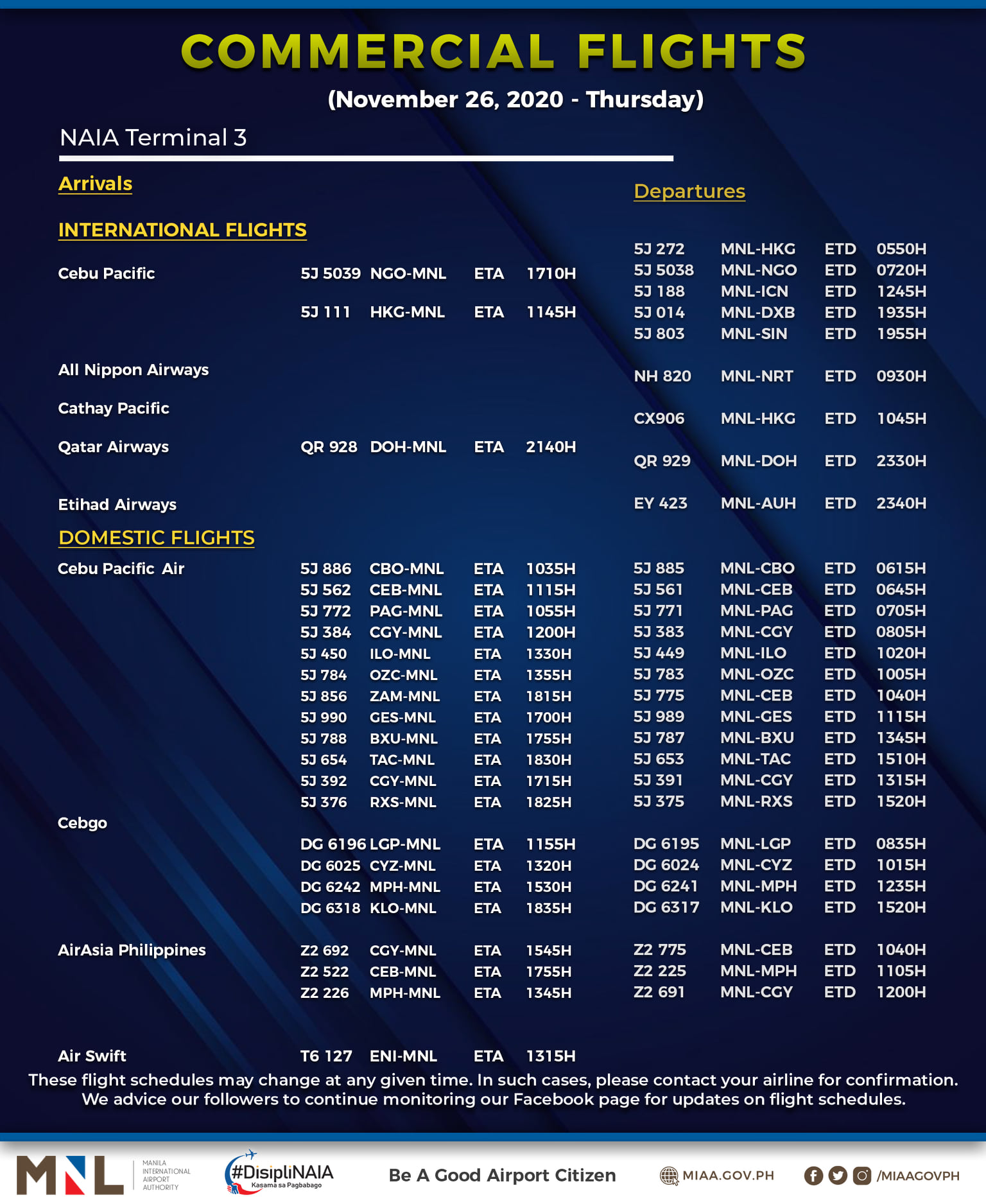 (Eagle News) — The Manila International Airport Authority has released its list of operational commercial flights for Thursday, Nov. 26: