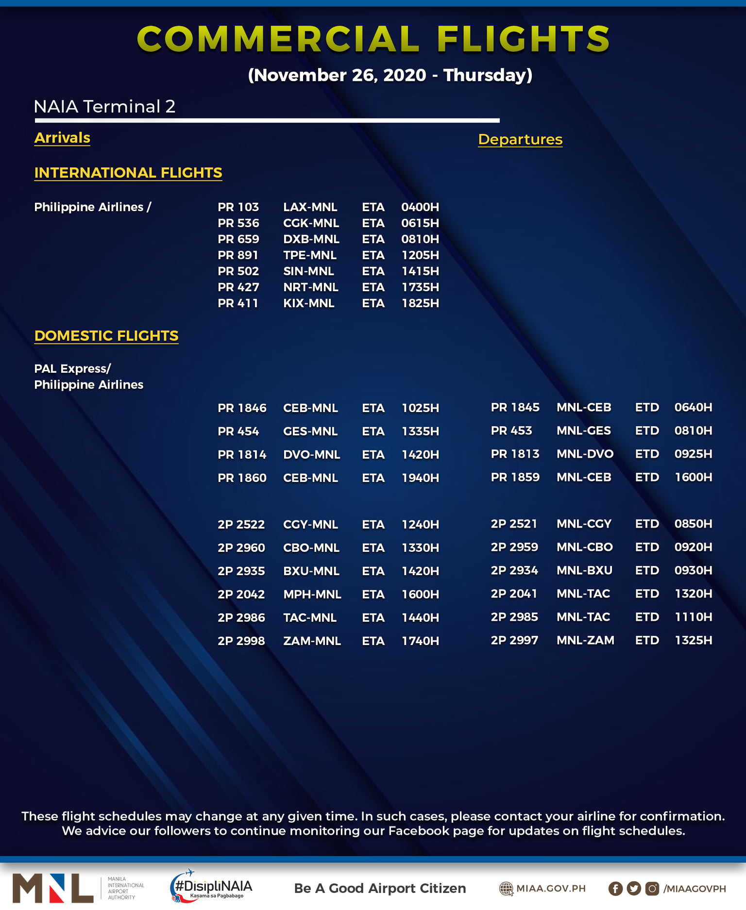 (Eagle News) — The Manila International Airport Authority has released its list of operational commercial flights for Thursday, Nov. 26: