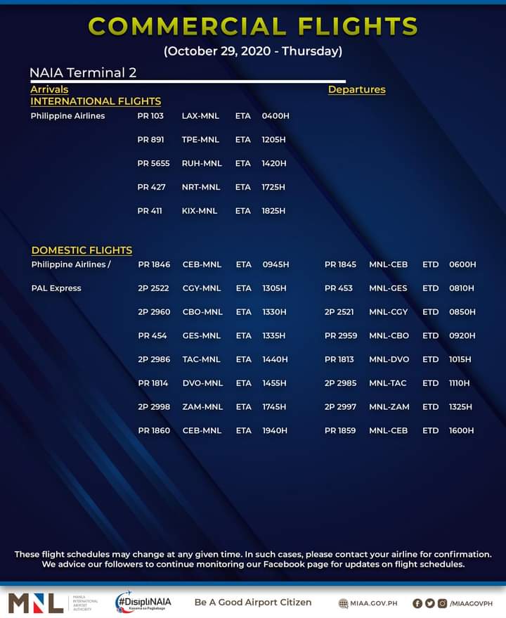(Eagle News)–The Manila International Airport Authority has released its list of operational commercial flights for Thursday, Oct. 29: