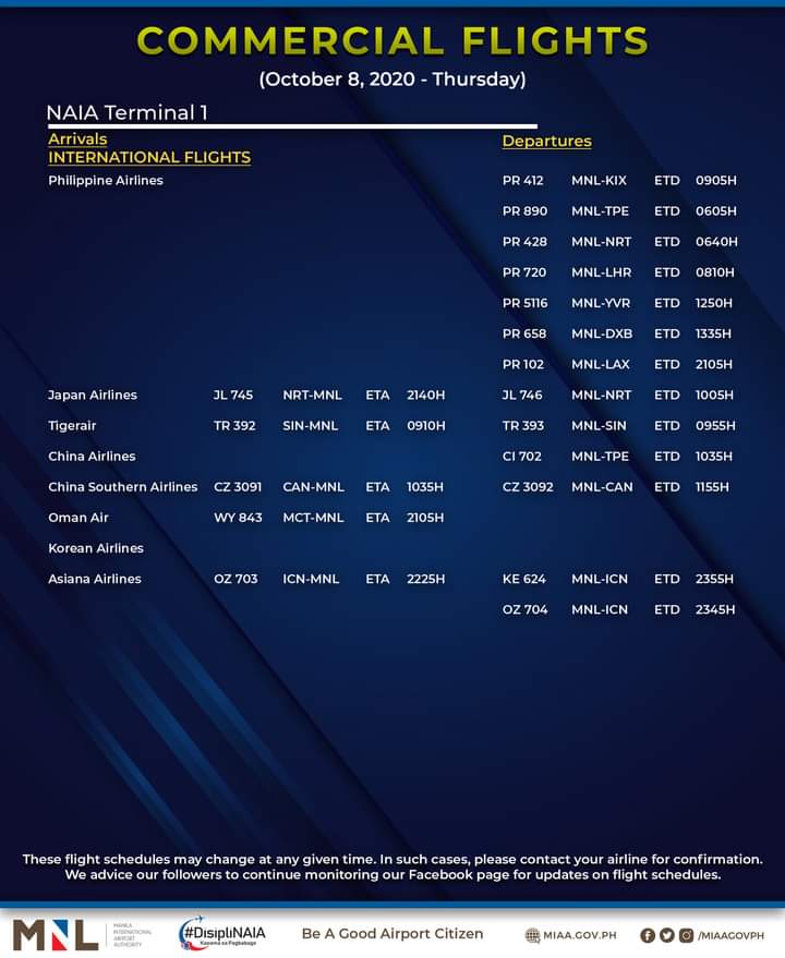 (Eagle News)–The Manila International Airport Authority has released its list of operational commercial flights for Thursday, Oct. 8: