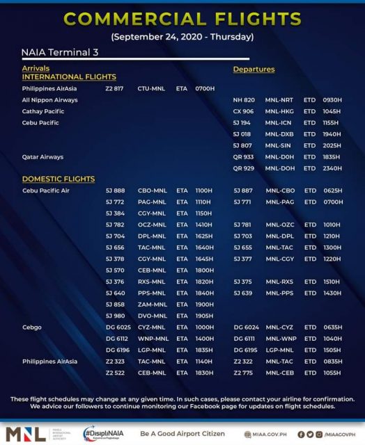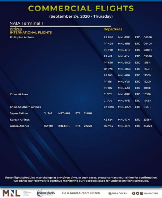 (Eagle News)–The Manila International Airport Authority has released its list of operational commercial flights for Thursday, Sept. 24: