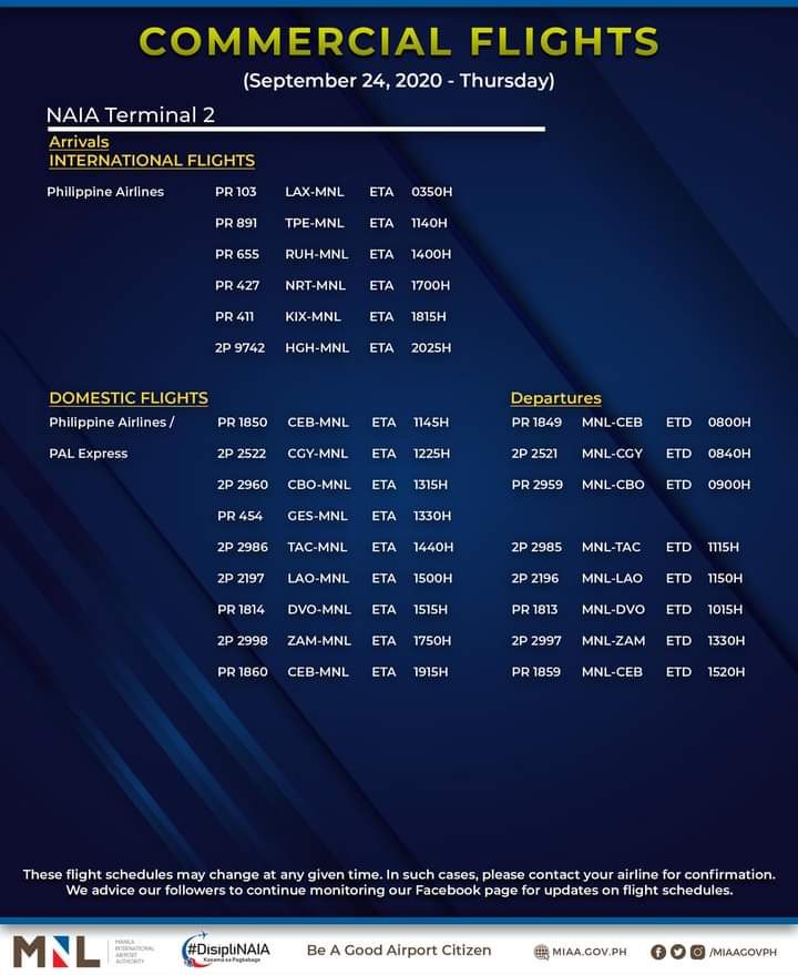 (Eagle News)–The Manila International Airport Authority has released its list of operational commercial flights for Thursday, Sept. 24: