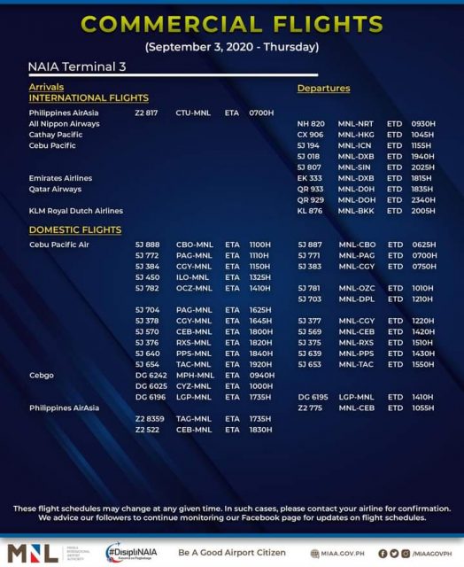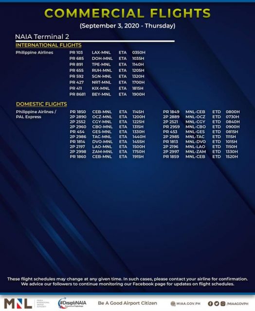 (Eagle News)–The Manila International Airport Authority has released its list of operational commercial flights for Thursday, Sept. 3: