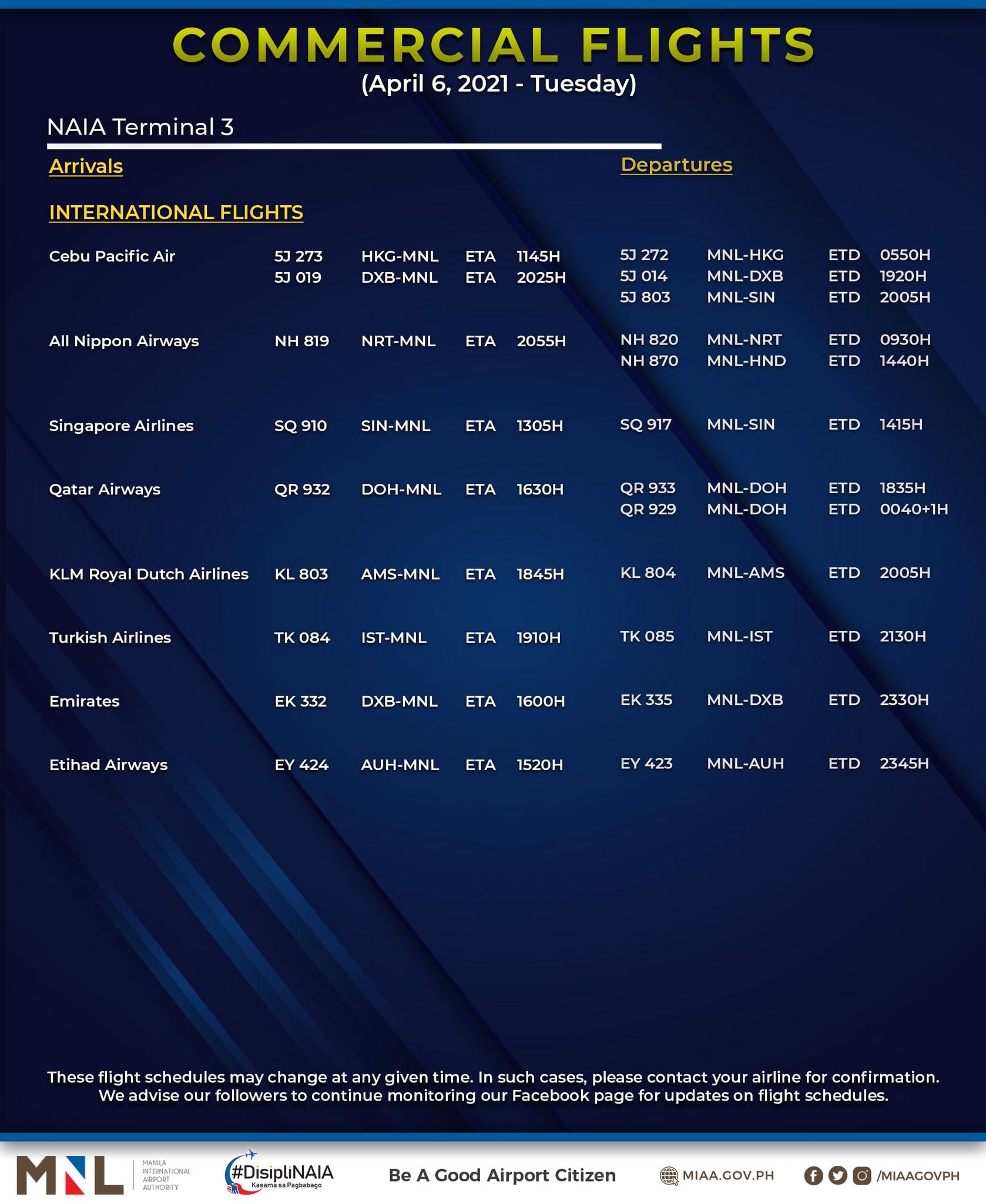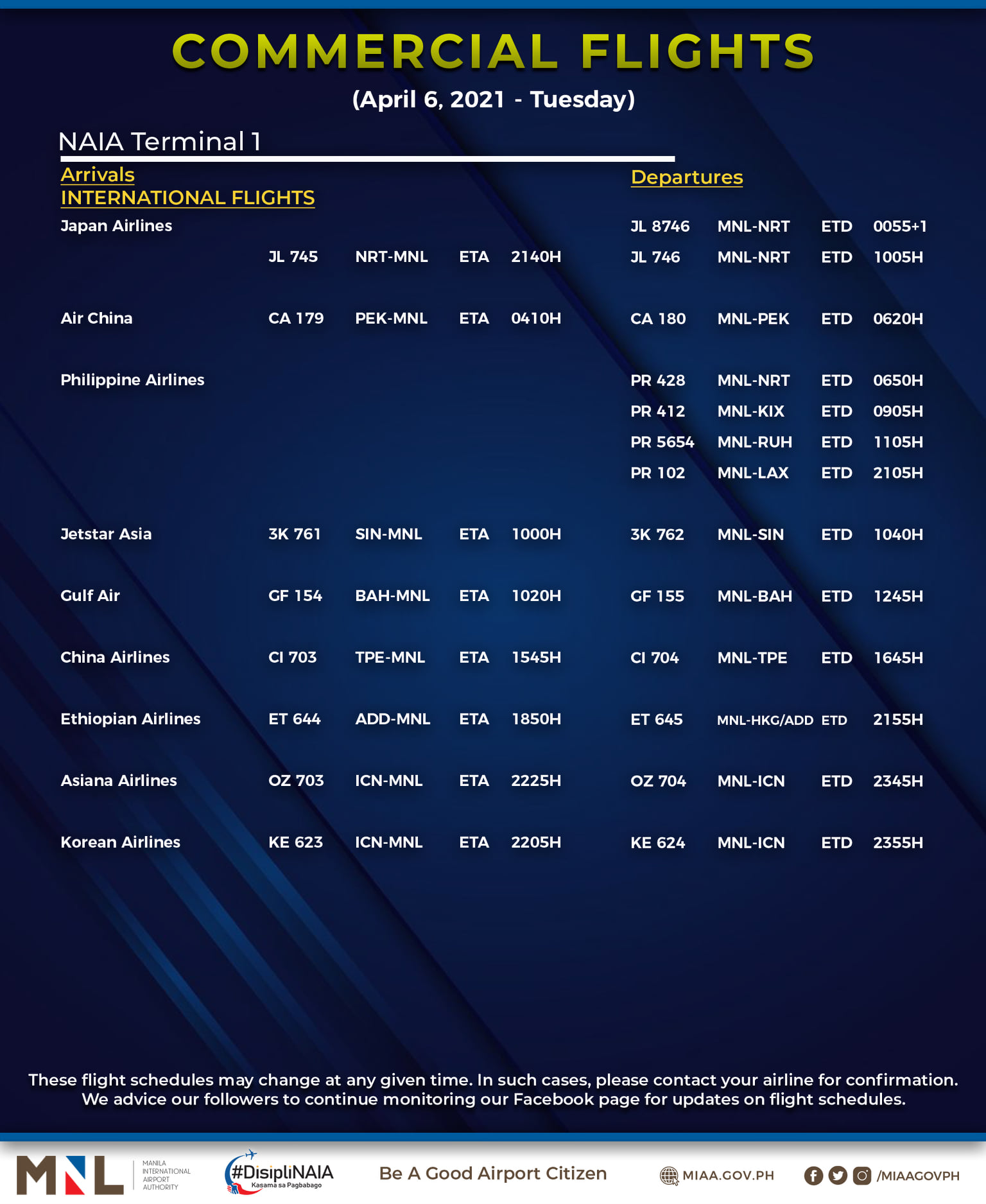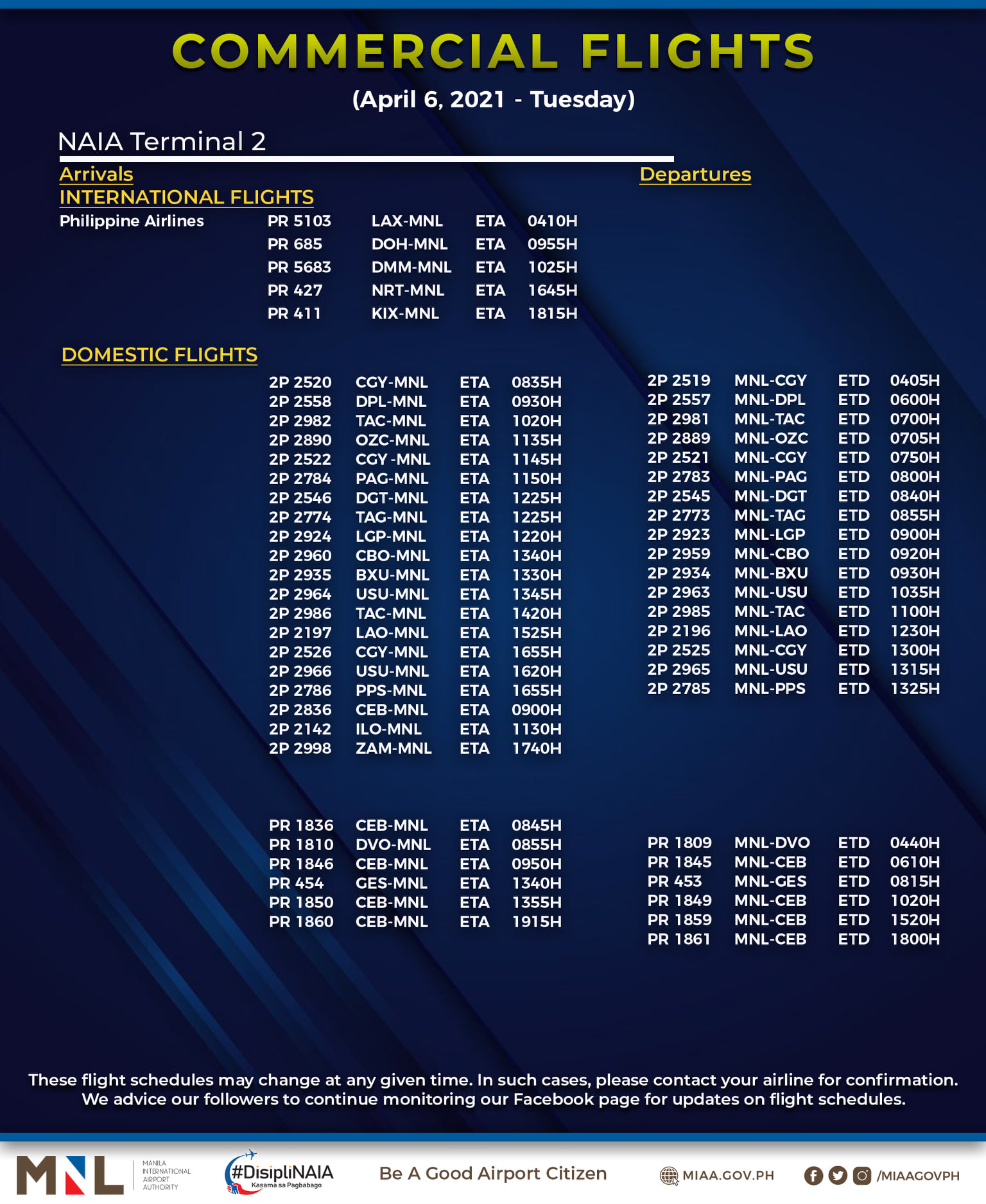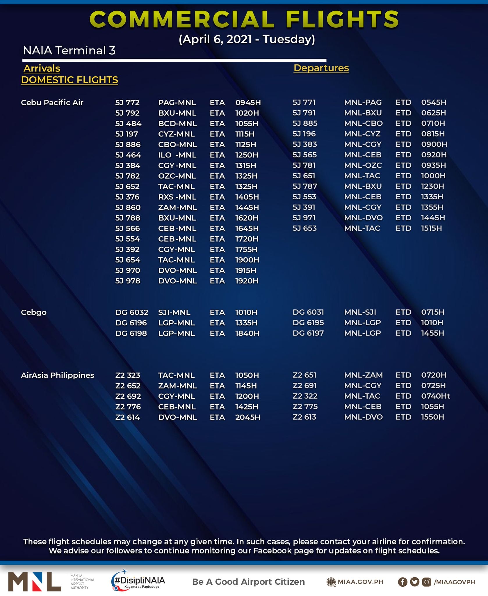 (Eagle News) — The Manila International Airport Authority has released its list of operational commercial flights for Tuesday, April 6: