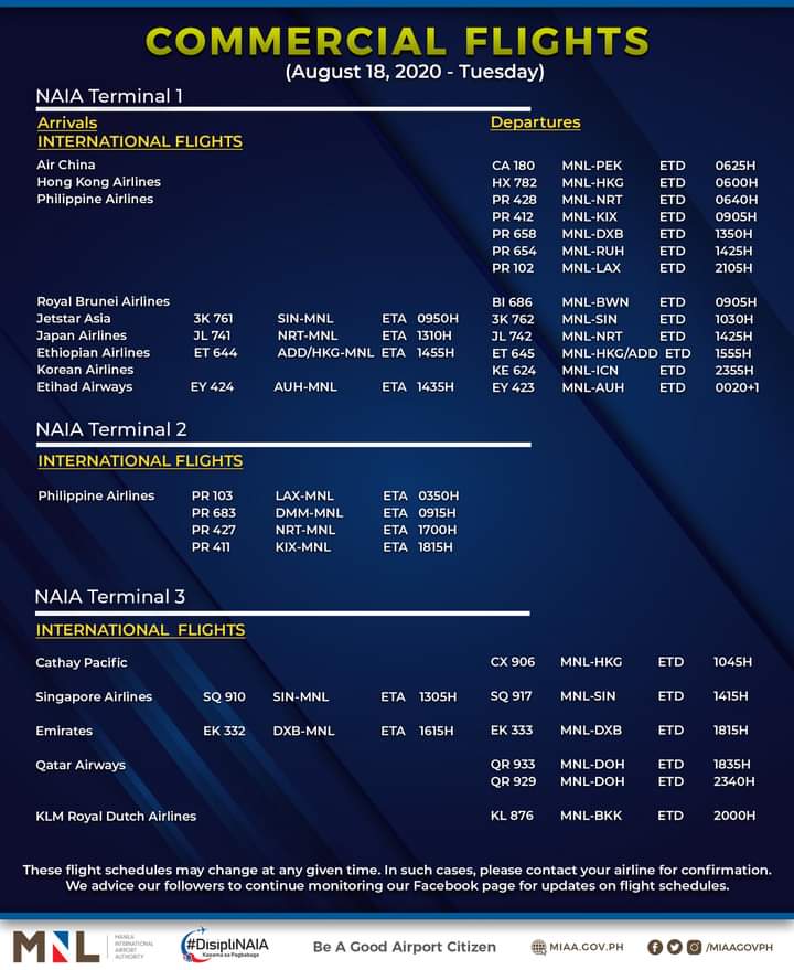 (Eagle News)–The Manila International Airport Authority has released its list of operational commercial flights for Tuesday, Aug. 18: