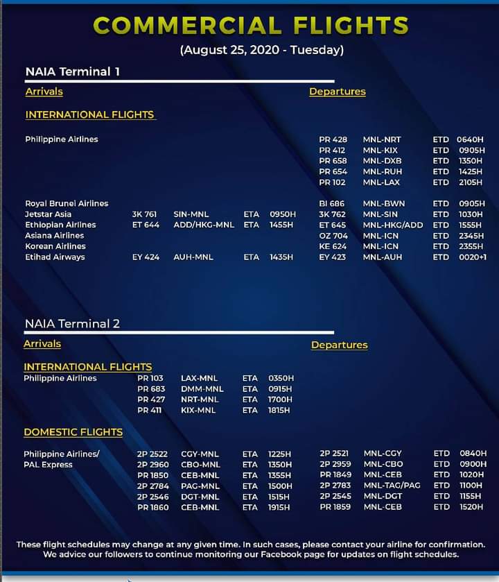 (Eagle News)–The Manila International Airport Authority has released its list of operational commercial flights for Tuesday, Aug. 25: