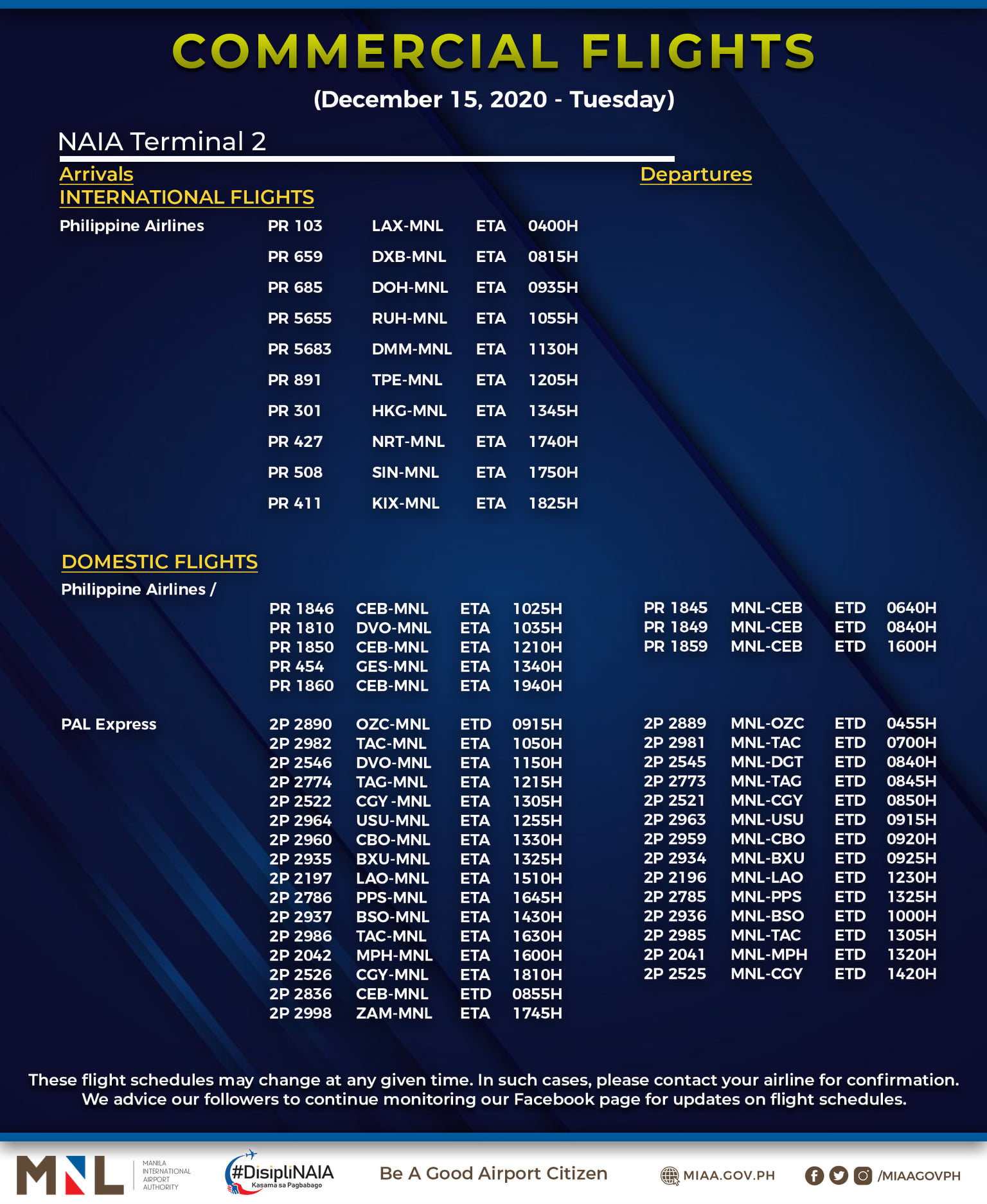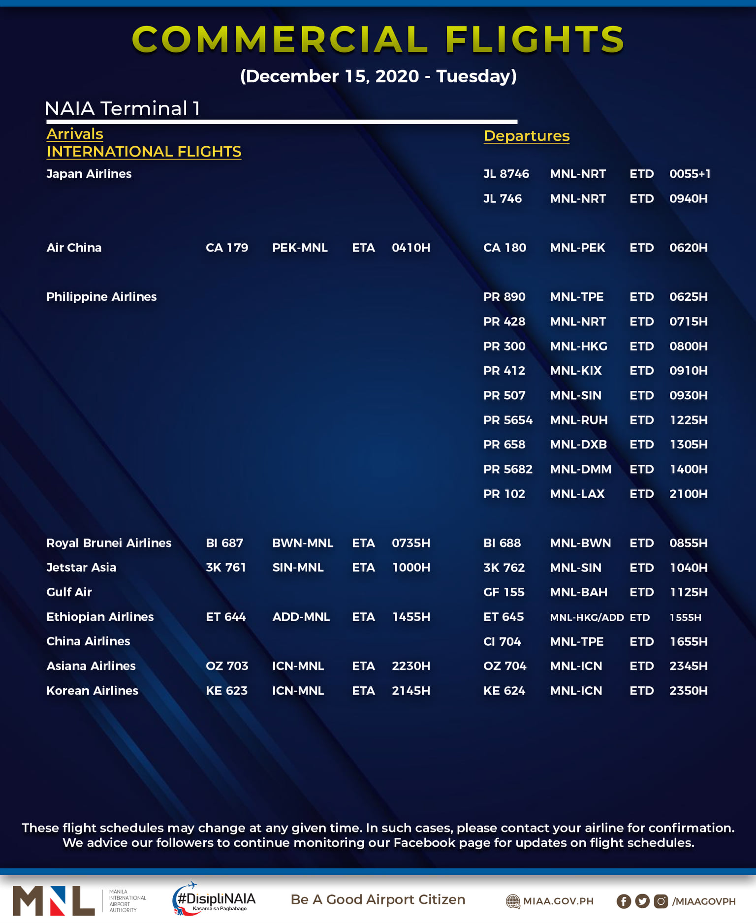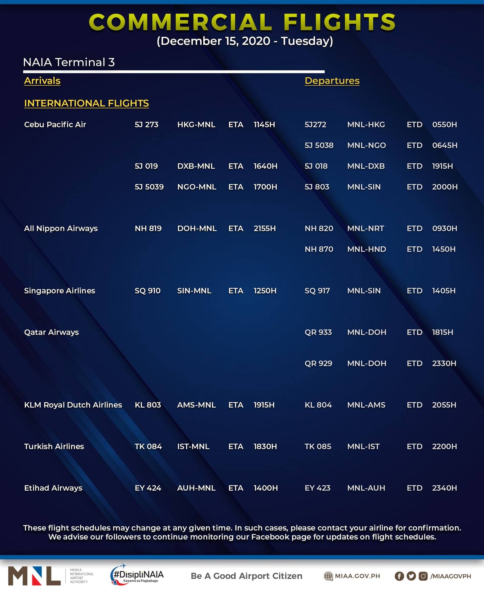 (Eagle News) — The Manila International Airport Authority has released its list of operational commercial flights for Tuesday, December 15: