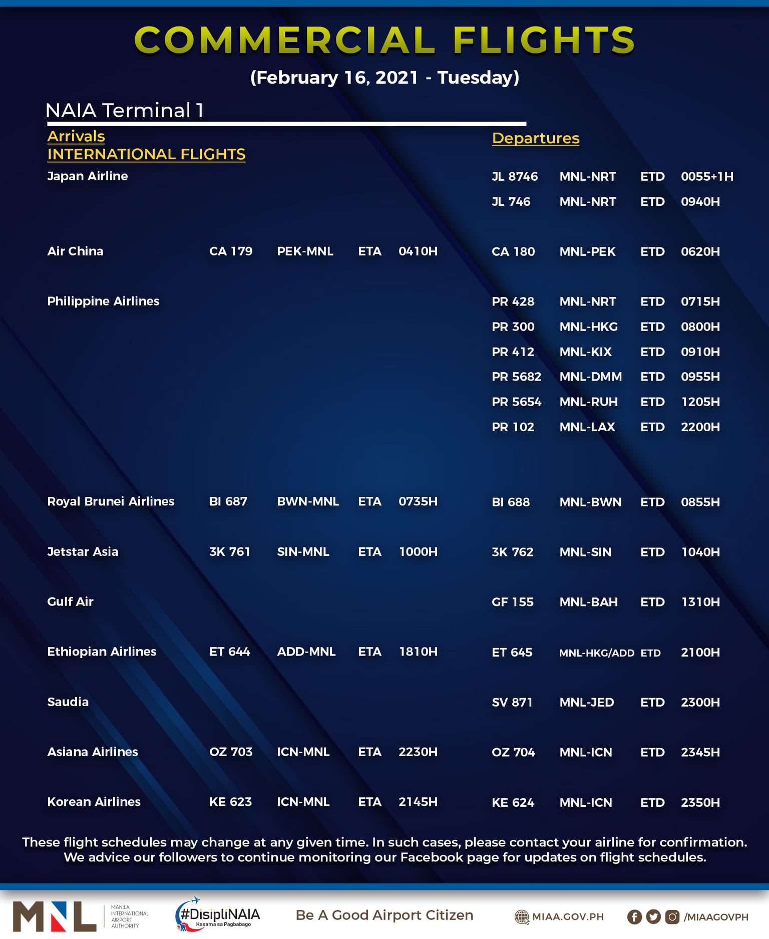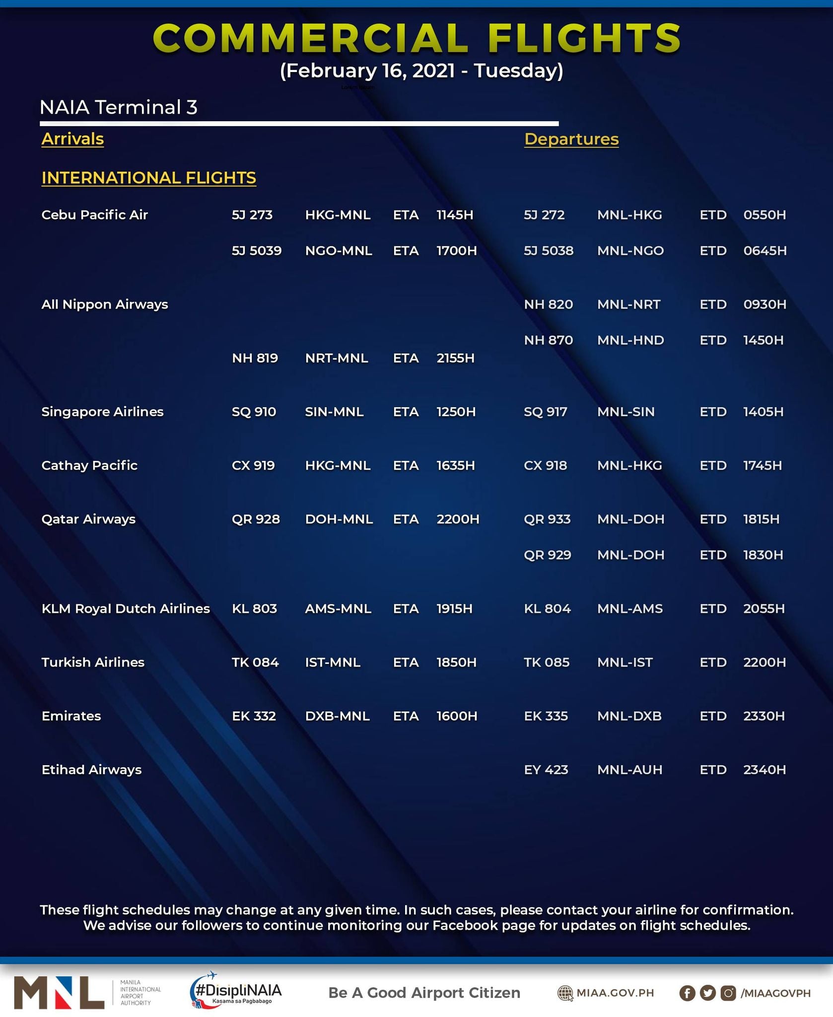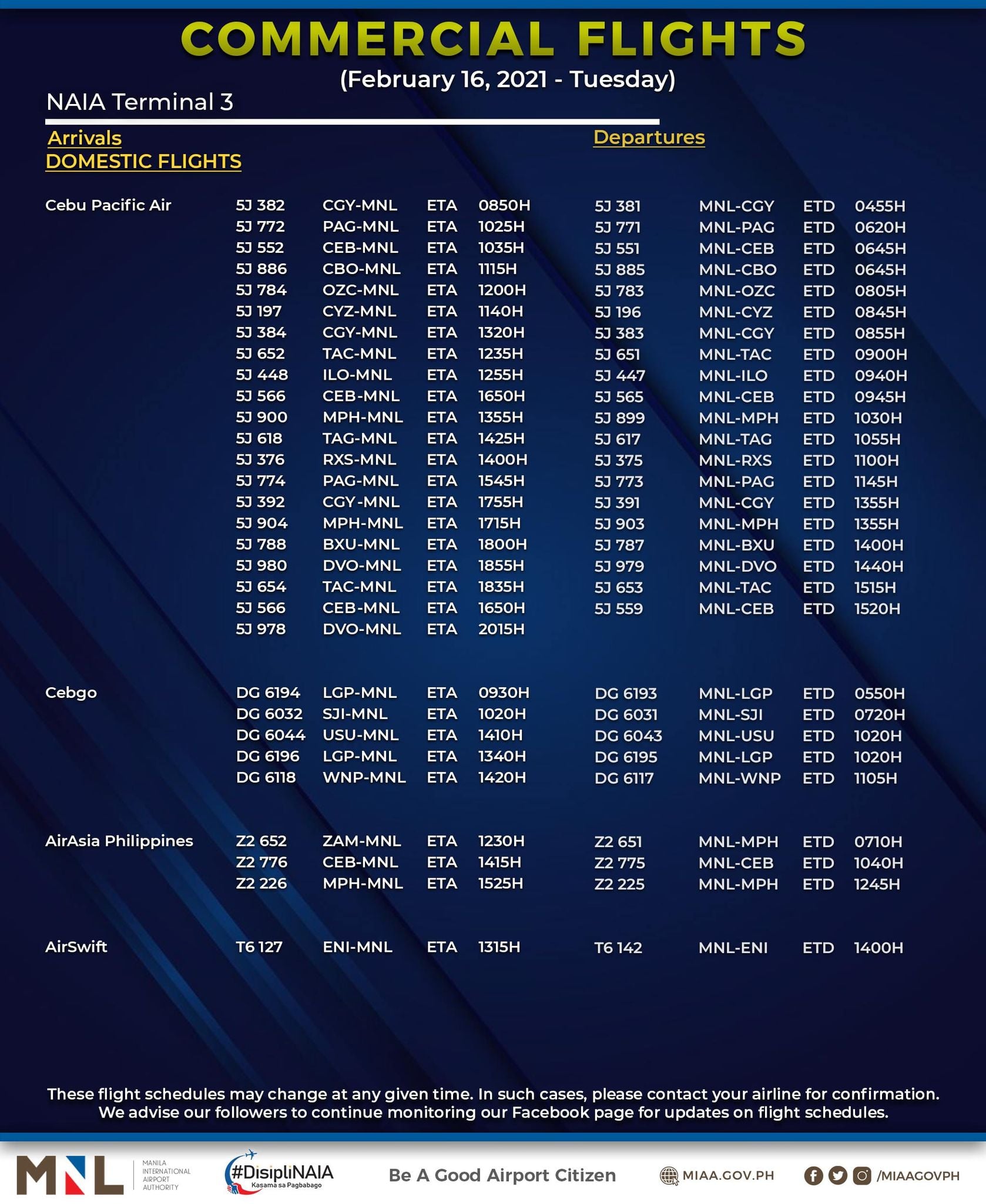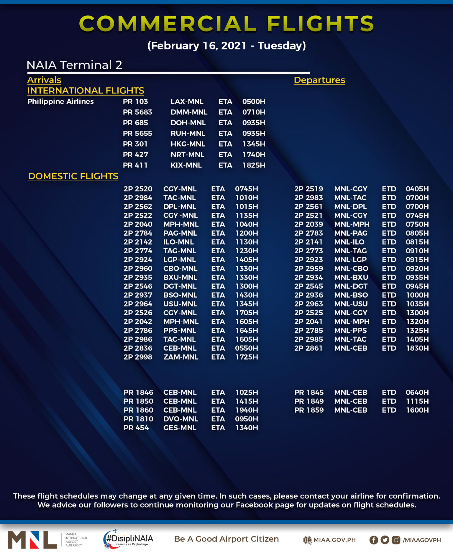 (Eagle News) — The Manila International Airport Authority has released its list of operational commercial flights for Tuesday, Feb. 16:
