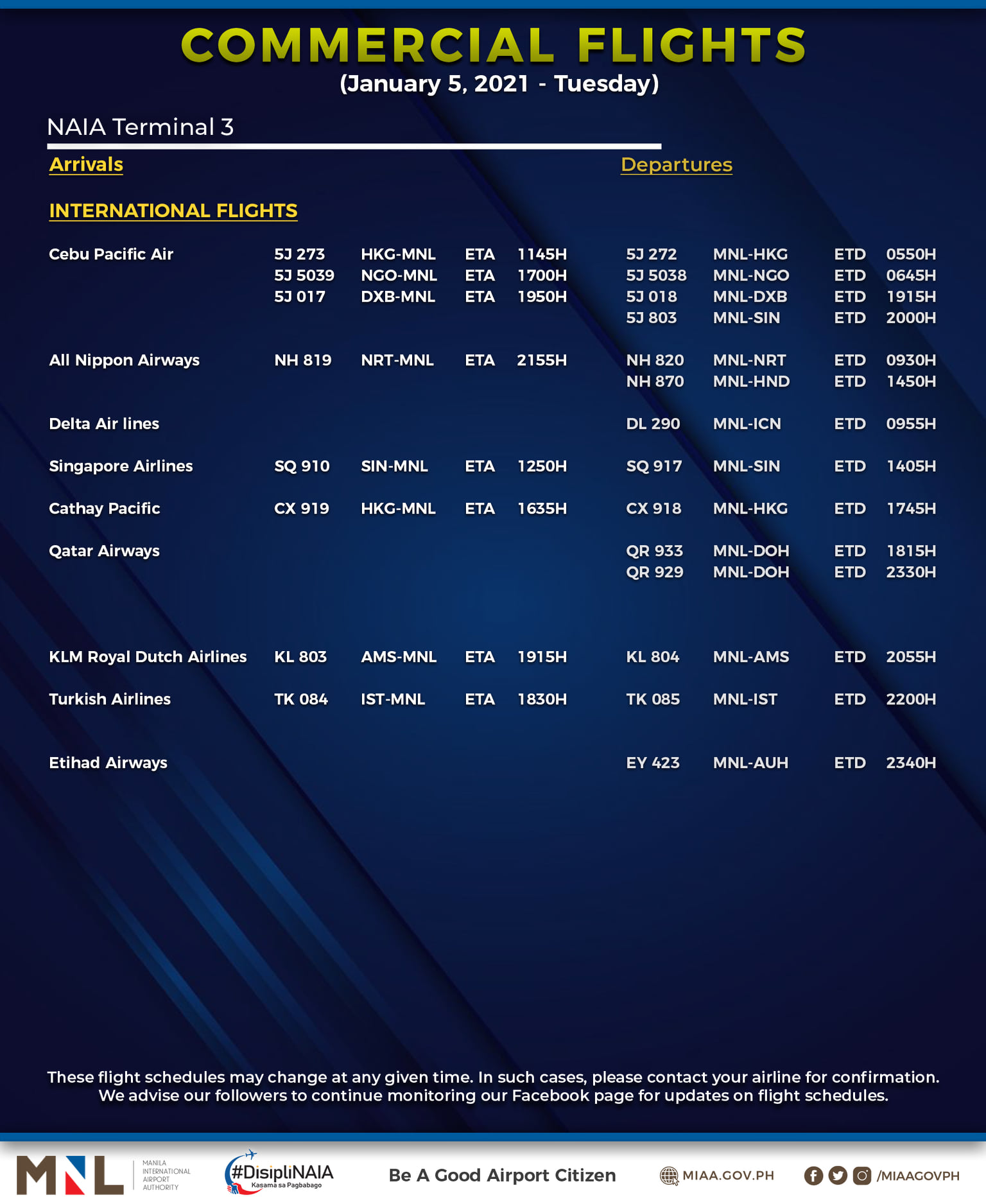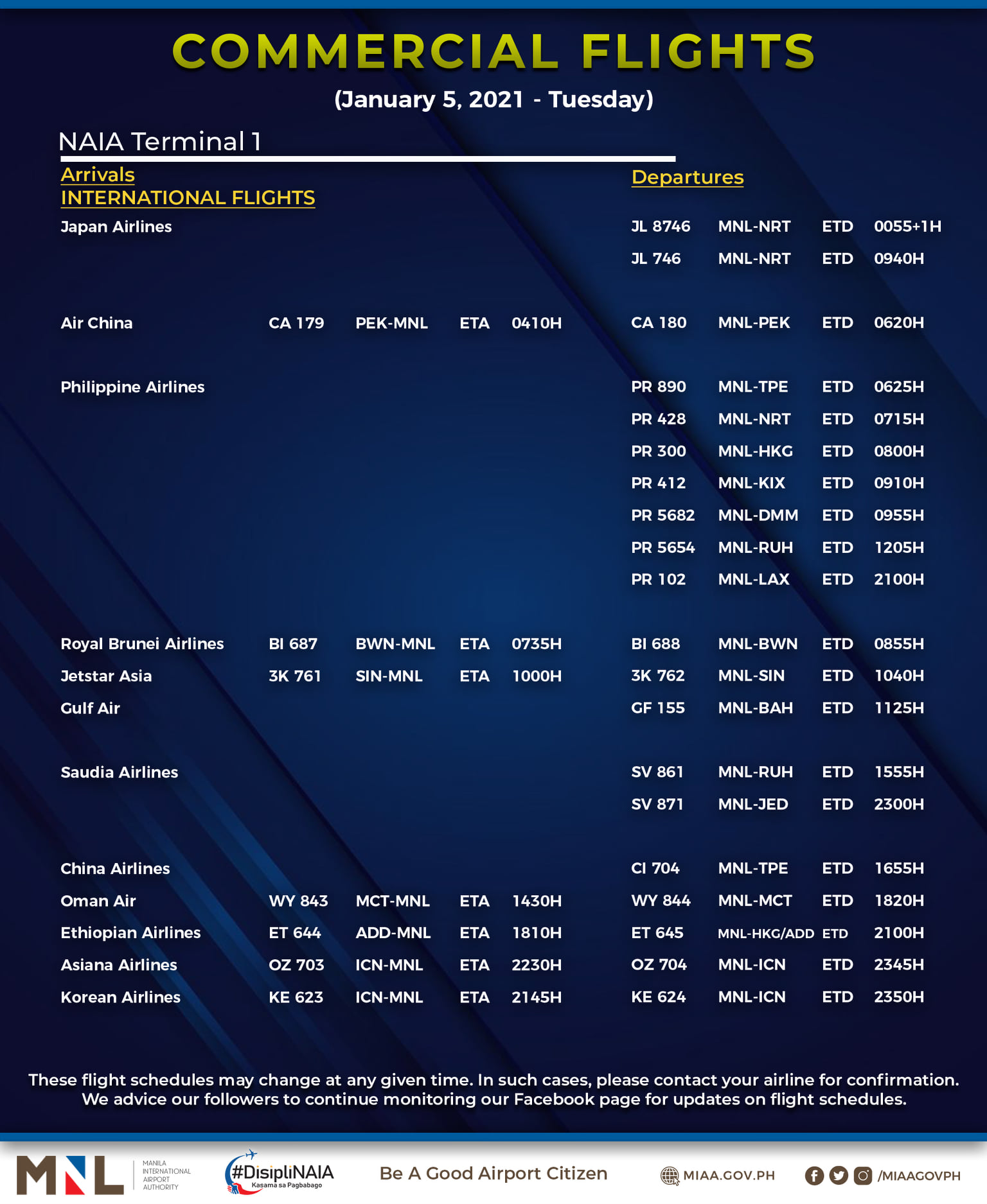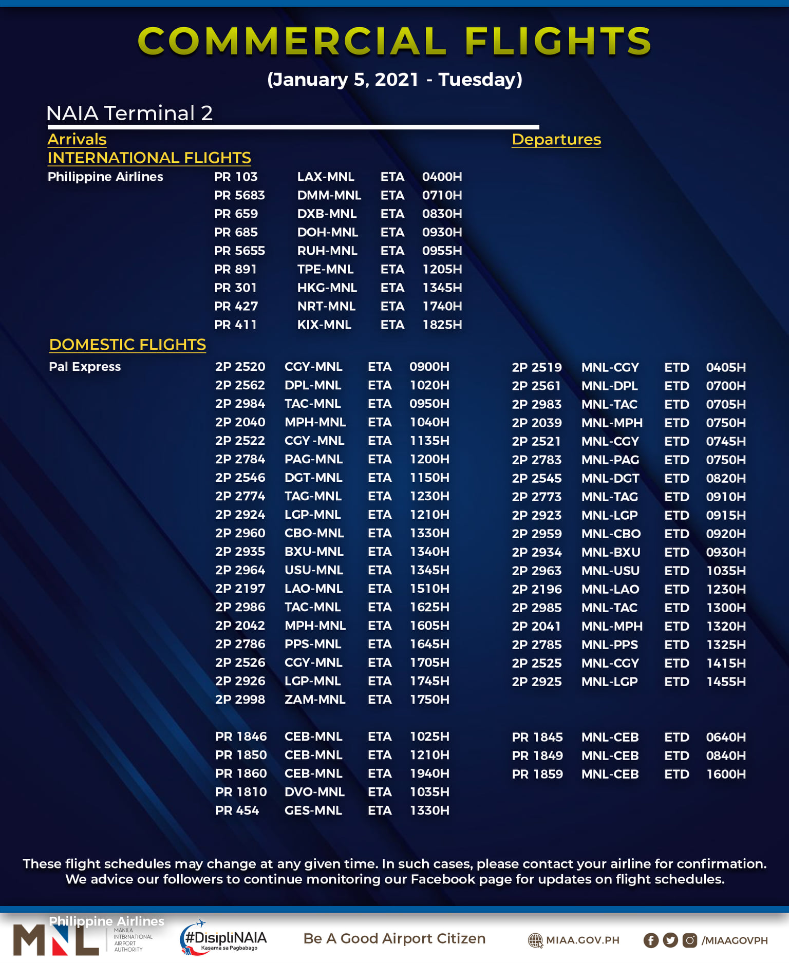 (Eagle News) — The Manila International Airport Authority has released its list of operational commercial flights for Tuesday, January 5: