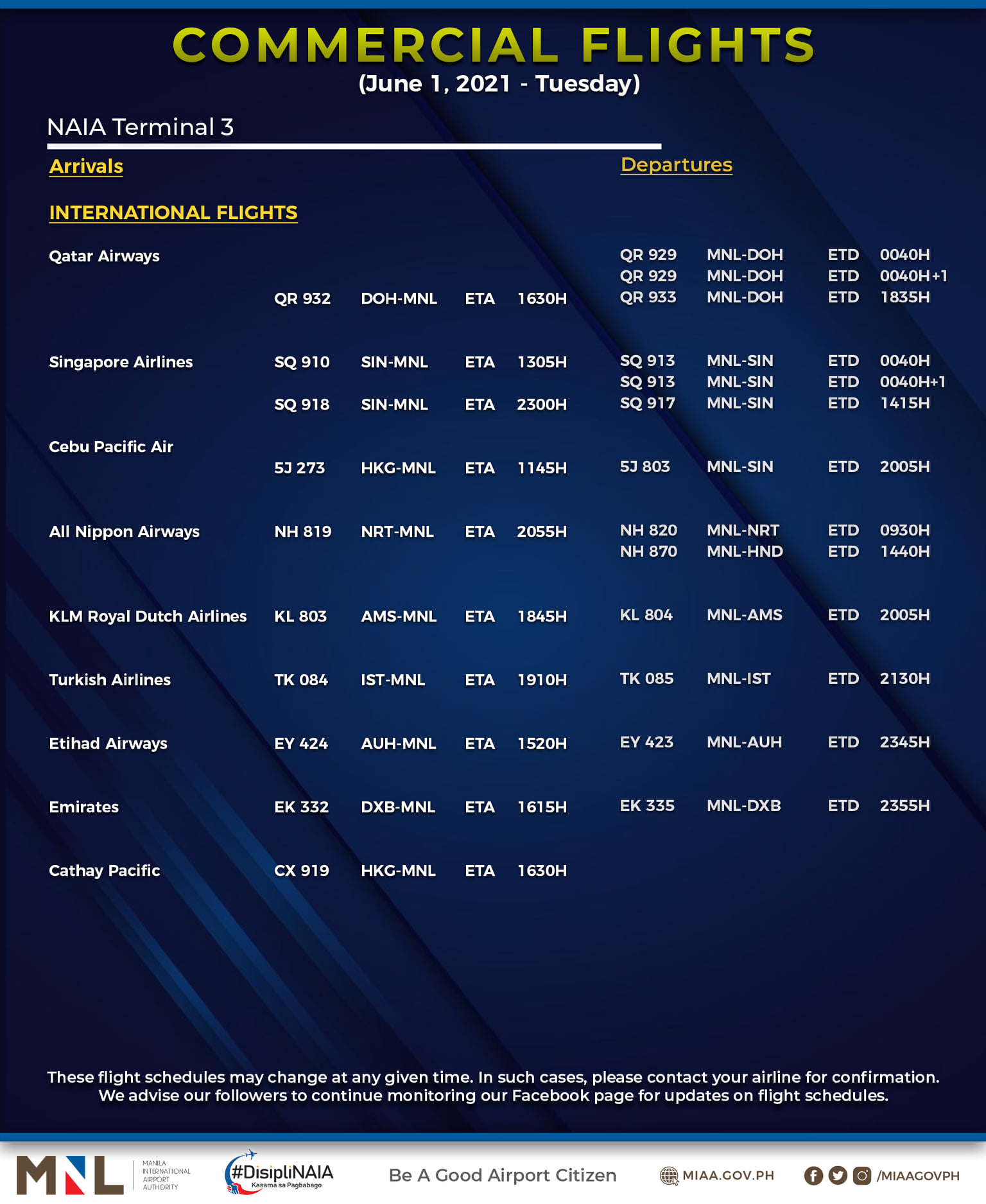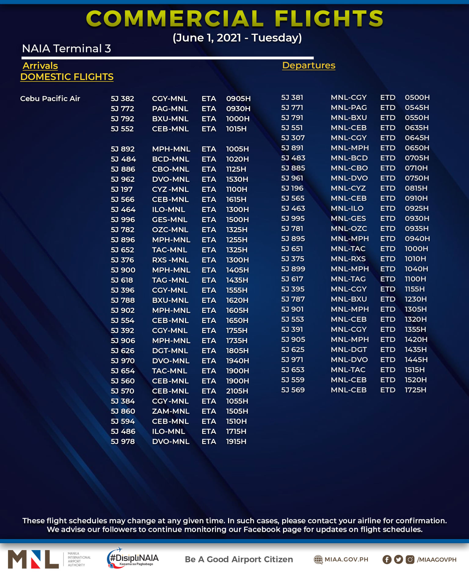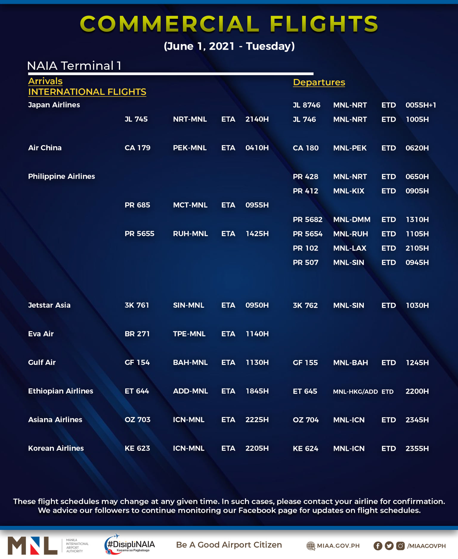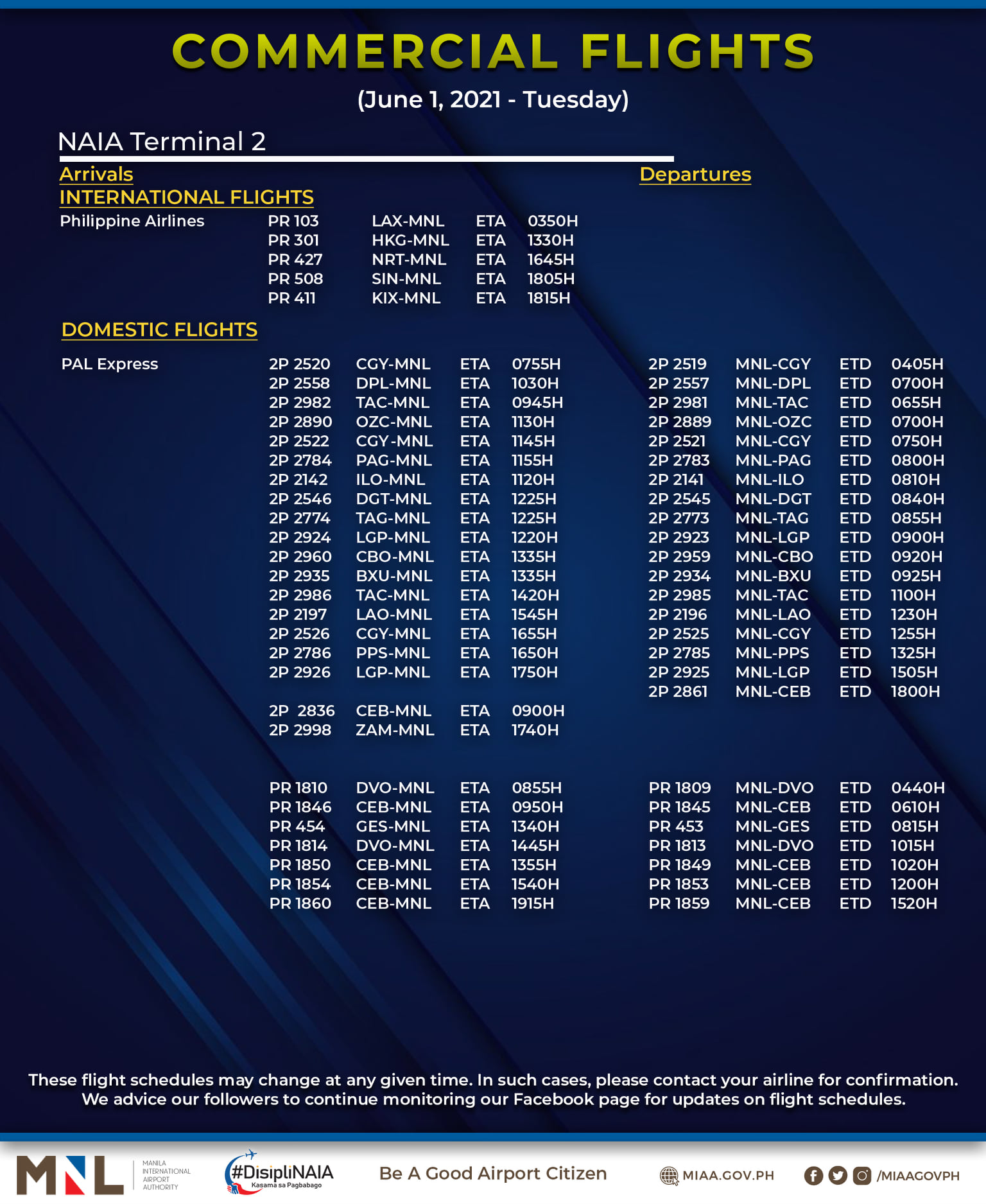 (Eagle News) — The Manila International Airport Authority has released its list of operational commercial flights for Tuesday, June 1: