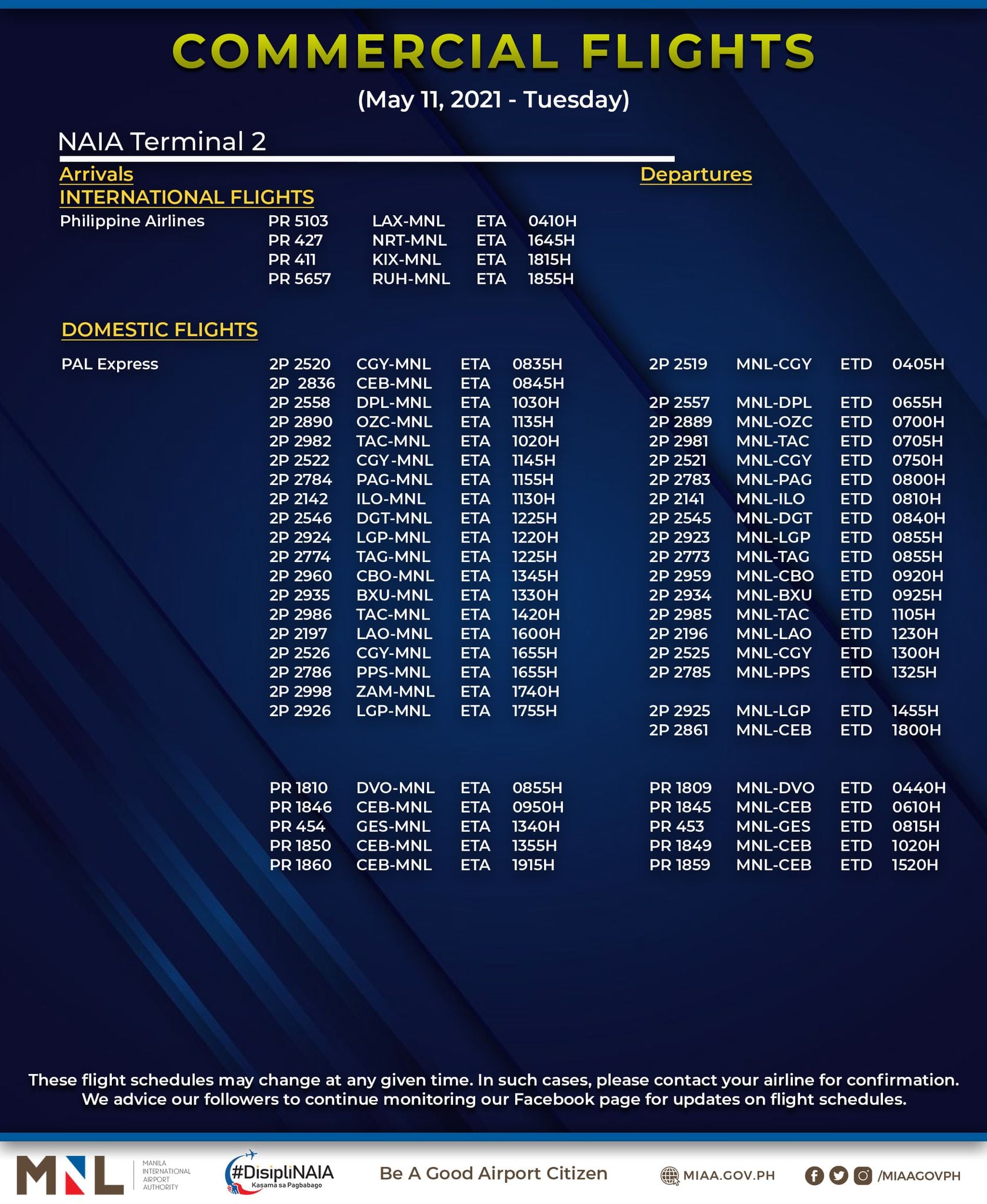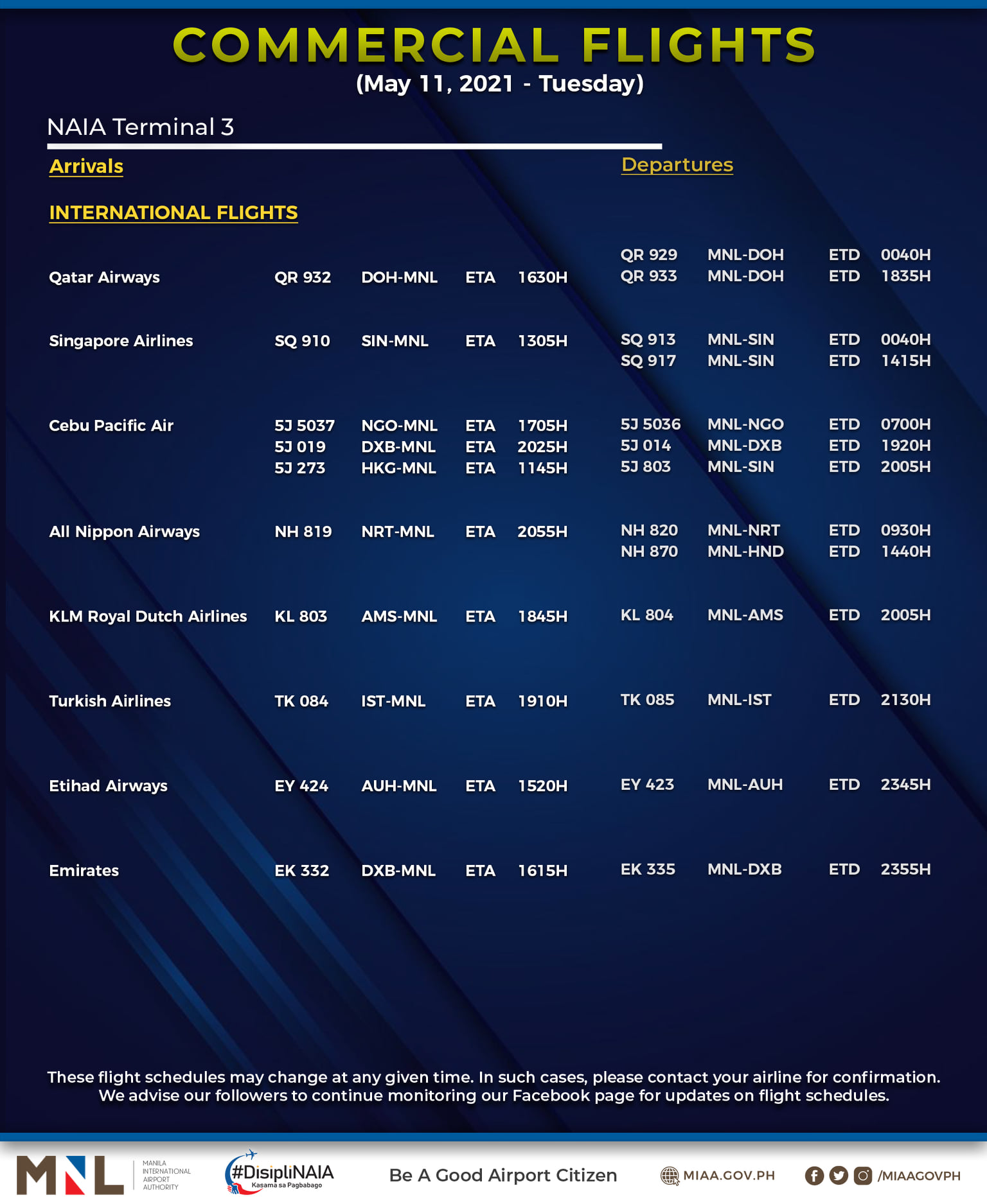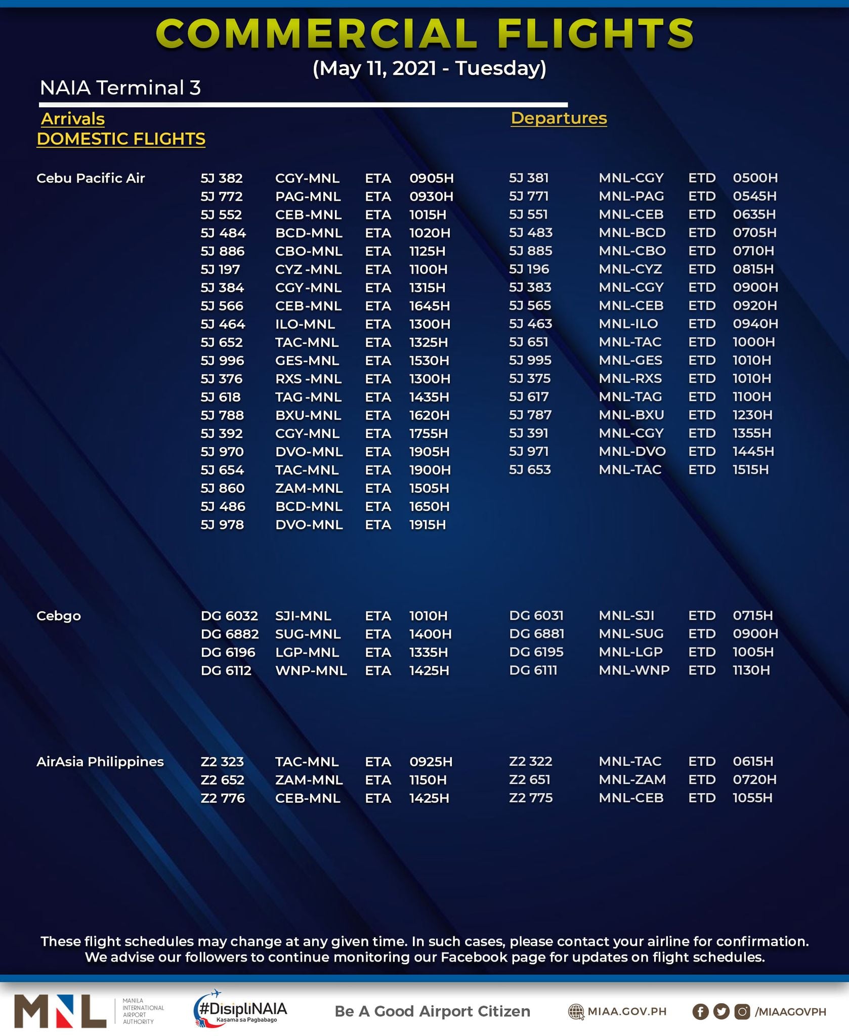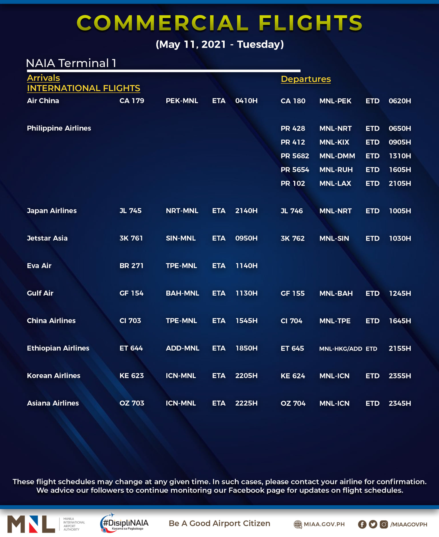 (Eagle News) — The Manila International Airport Authority has released its list of operational commercial flights for Tuesday, May 11: