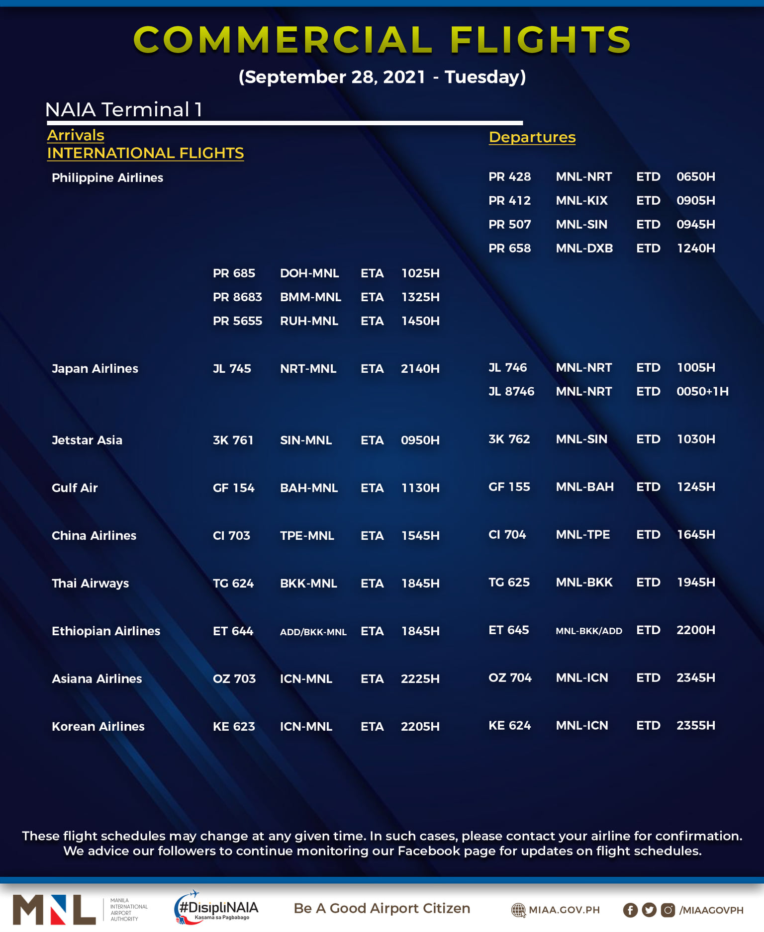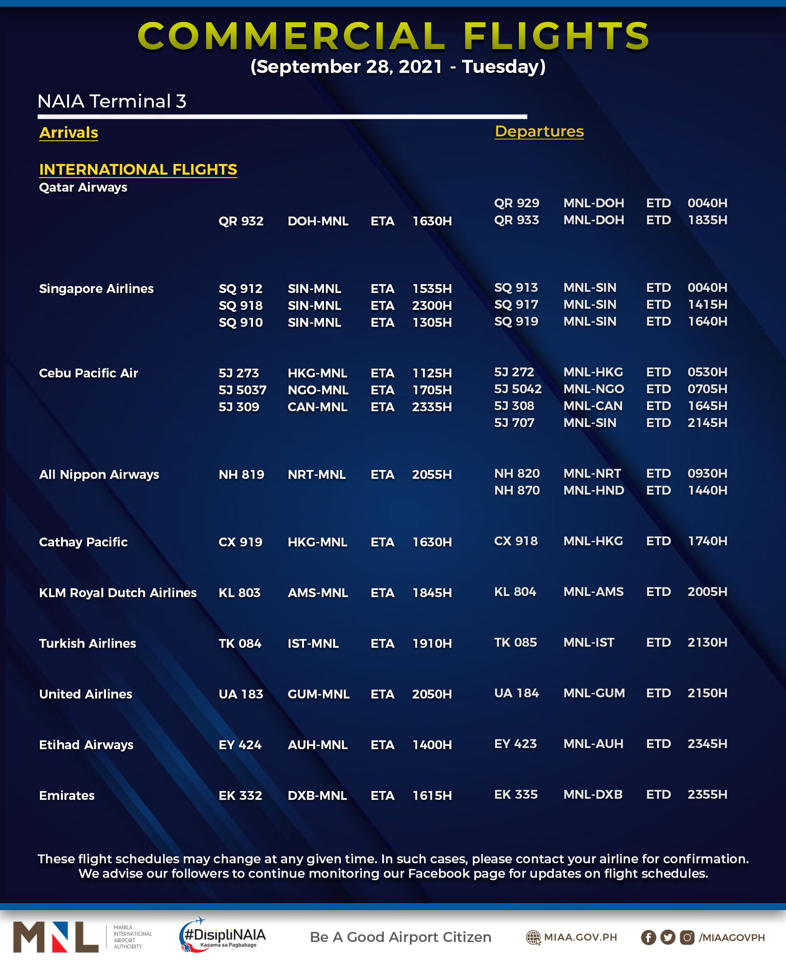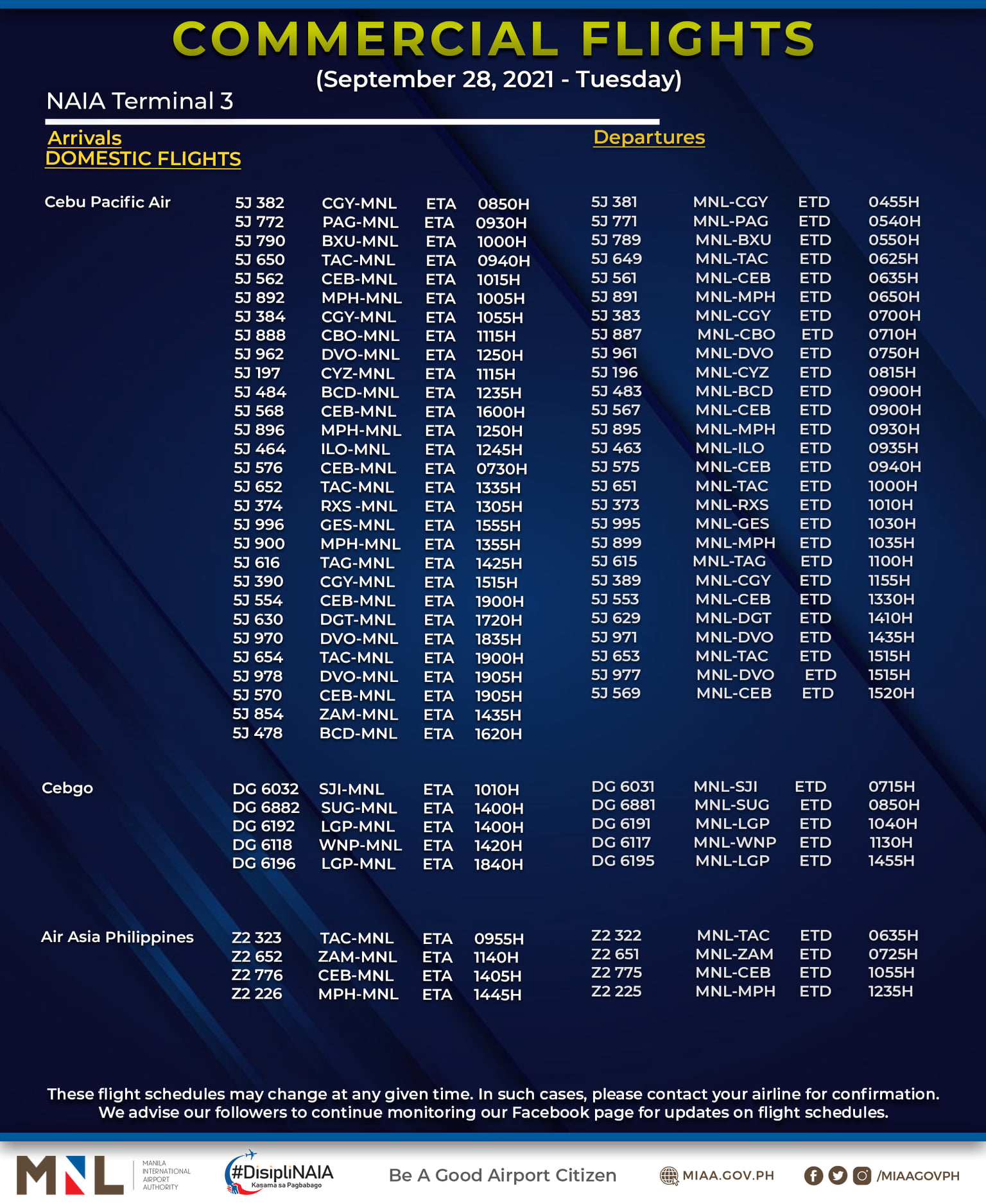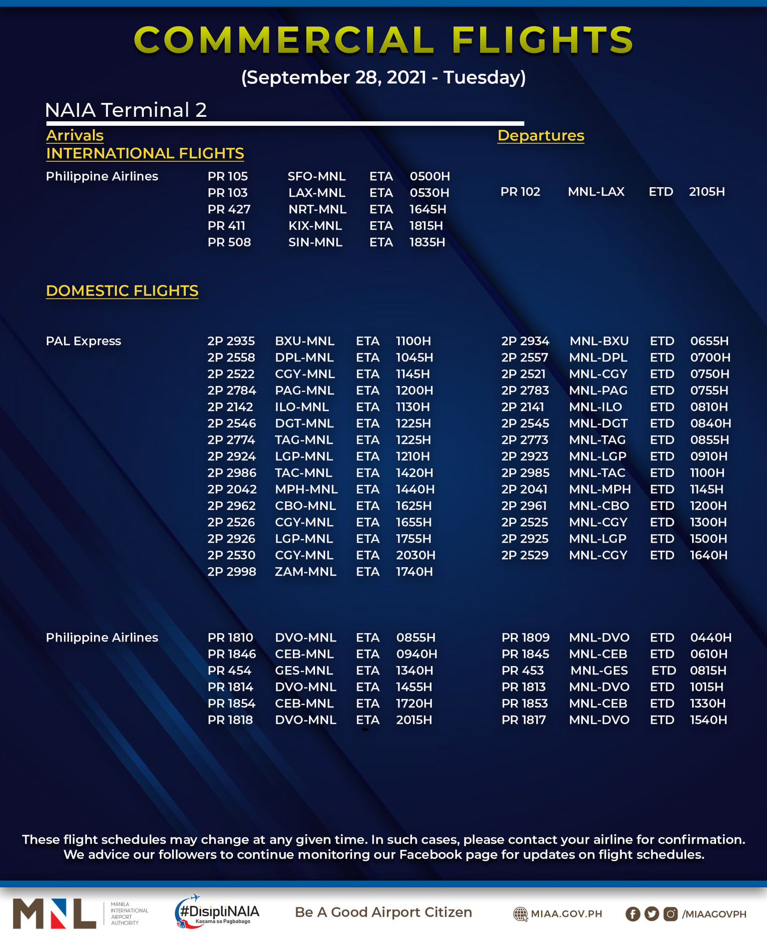 (Eagle News) — The Manila International Airport Authority has released its list of operational commercial flights for Tuesday, Sept. 28: