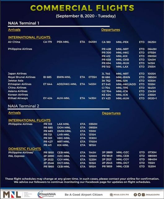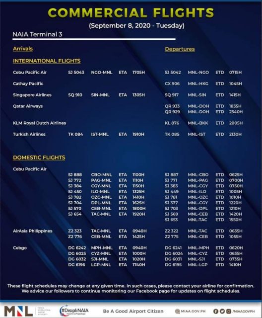 (Eagle News)–The Manila International Airport Authority has released its list of operational commercial flights for Tuesday, Sept. 8: