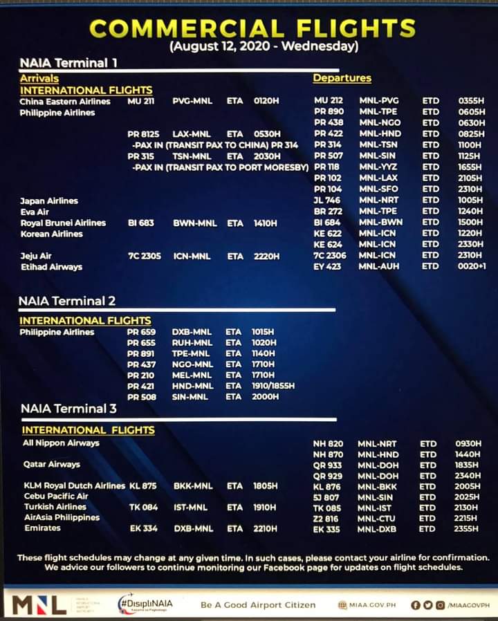 (Eagle News)–The Manila International Airport Authority has released its list of operational commercial flights for Aug. 12: