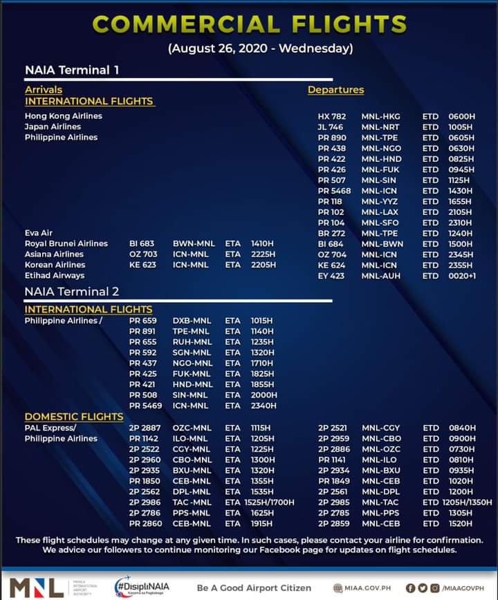 (Eagle News)–The Manila International Airport Authority has released its list of operational commercial flights for Wednesday, Aug. 26: