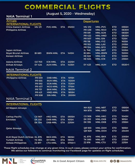 (Eagle News) — The Manila International Airport Authority has released its list of operational commercial flights for Wednesday, Aug. 5: