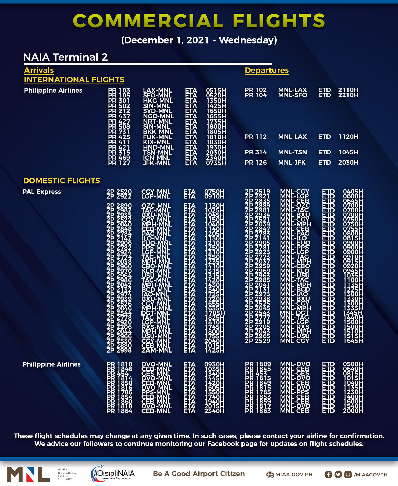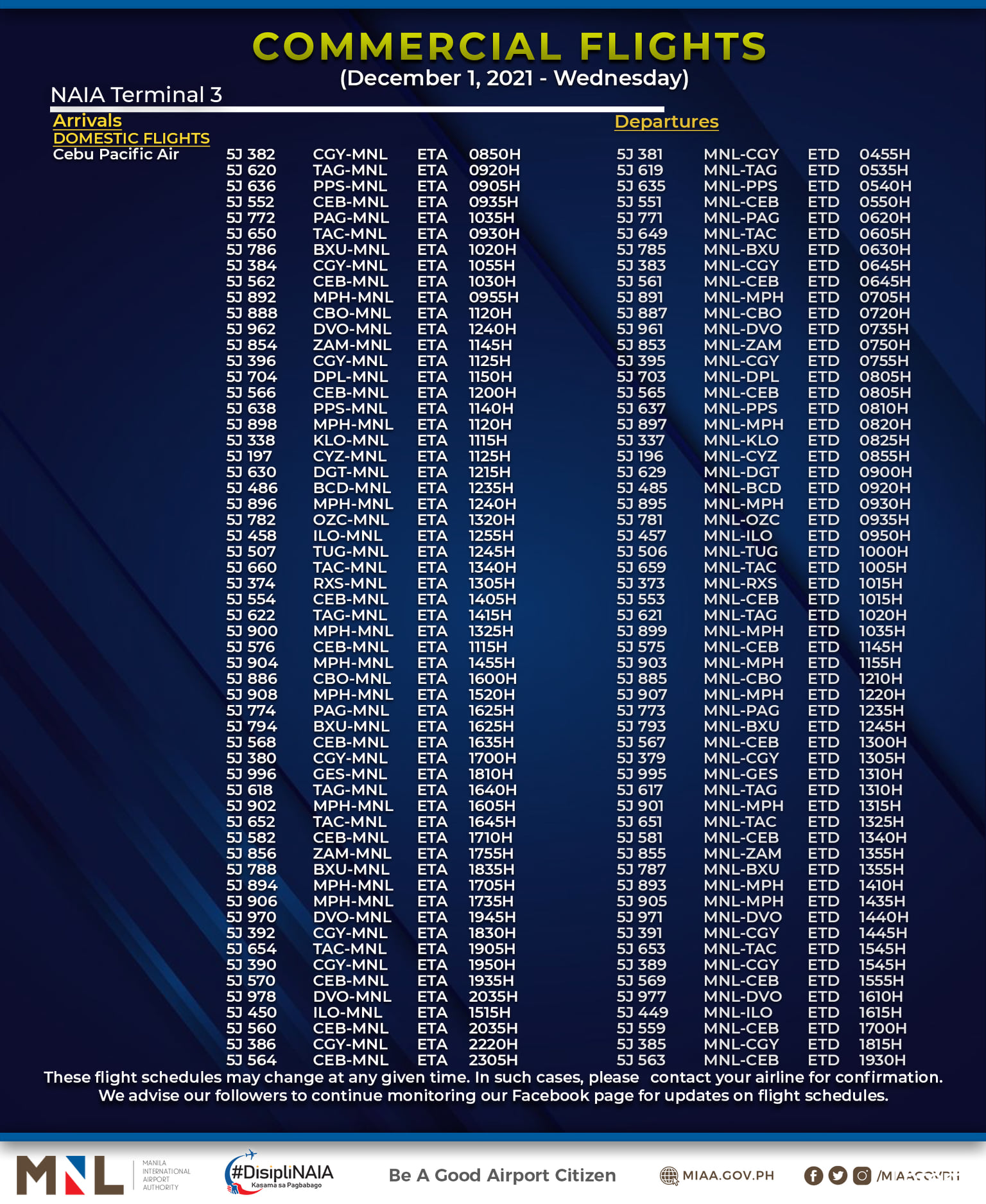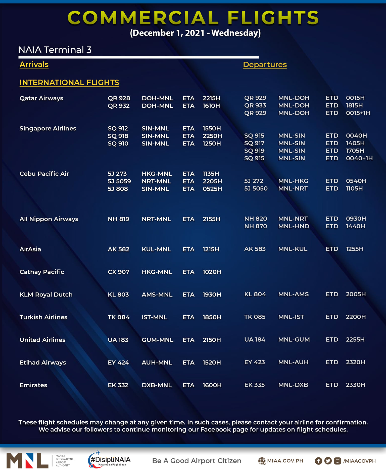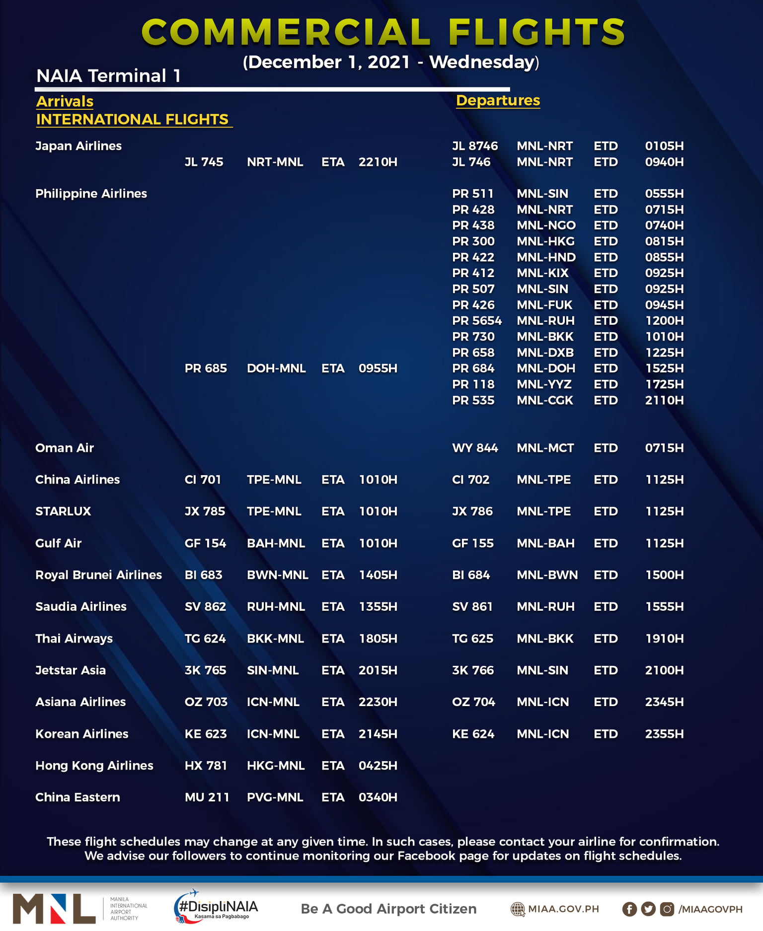 (Eagle News) — The Manila International Airport Authority has released its list of operational commercial flights for Wednesday, Dec. 1: