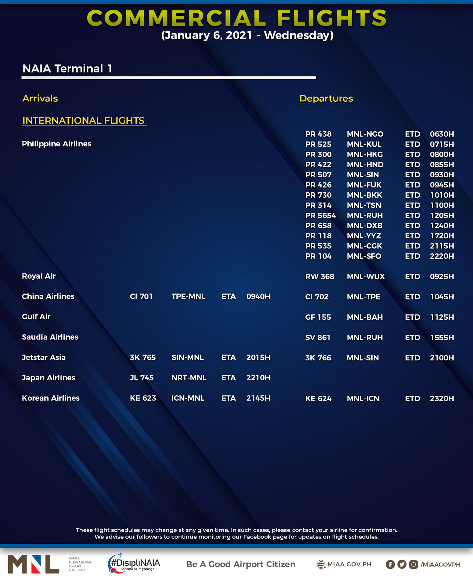 (Eagle News) — The Manila International Airport Authority has released its list of operational commercial flights for Wednesday, January 6: