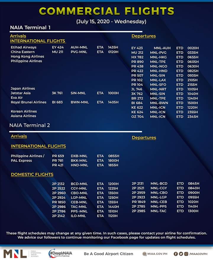 (Eagle News)–The Manila International Airport Authority has released its list of operational commercial flights for Wednesday, July 15: