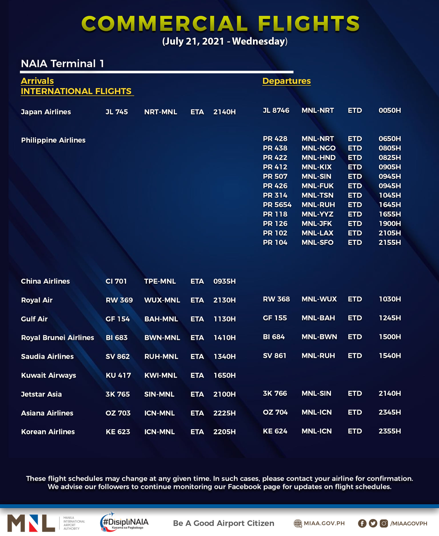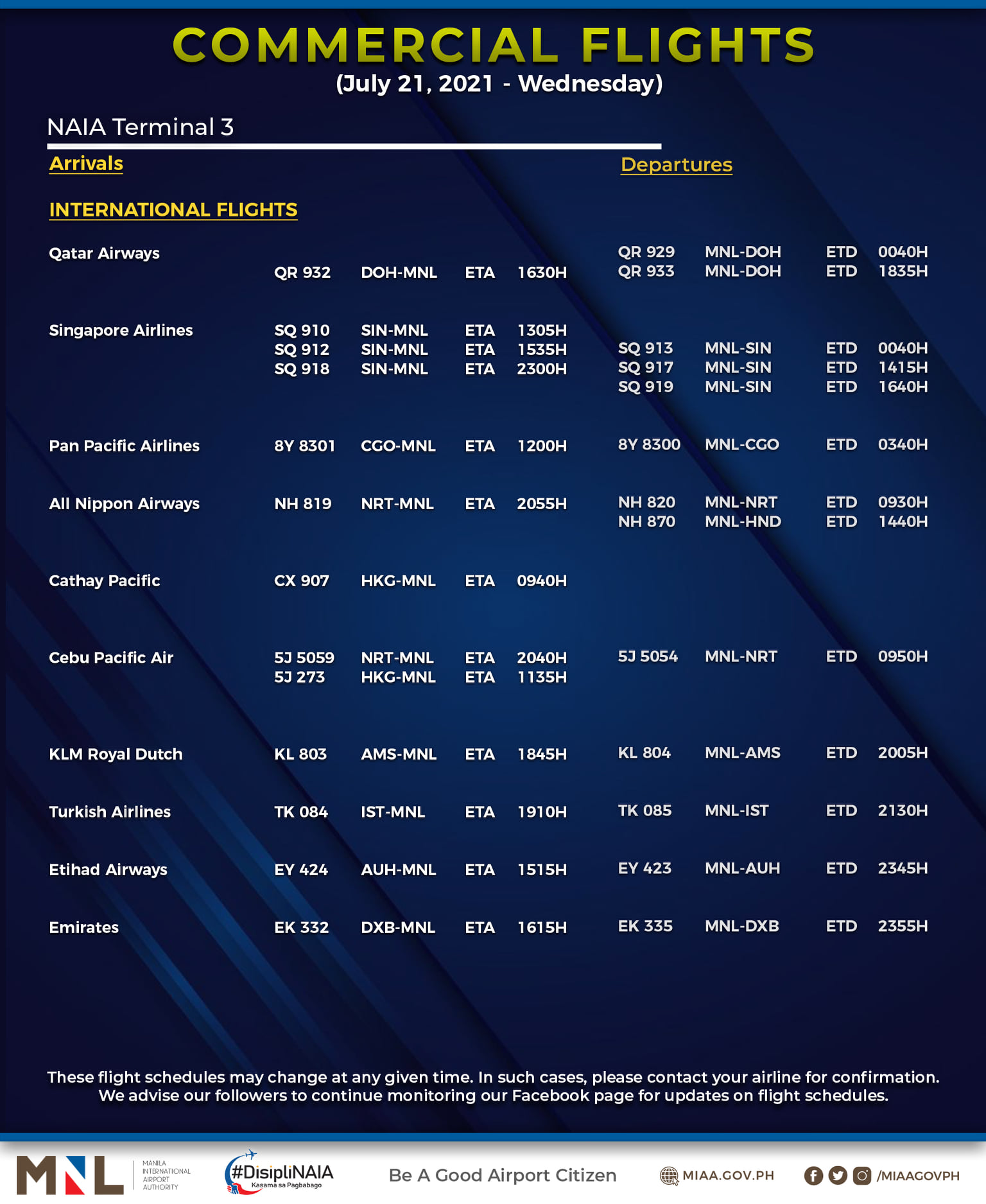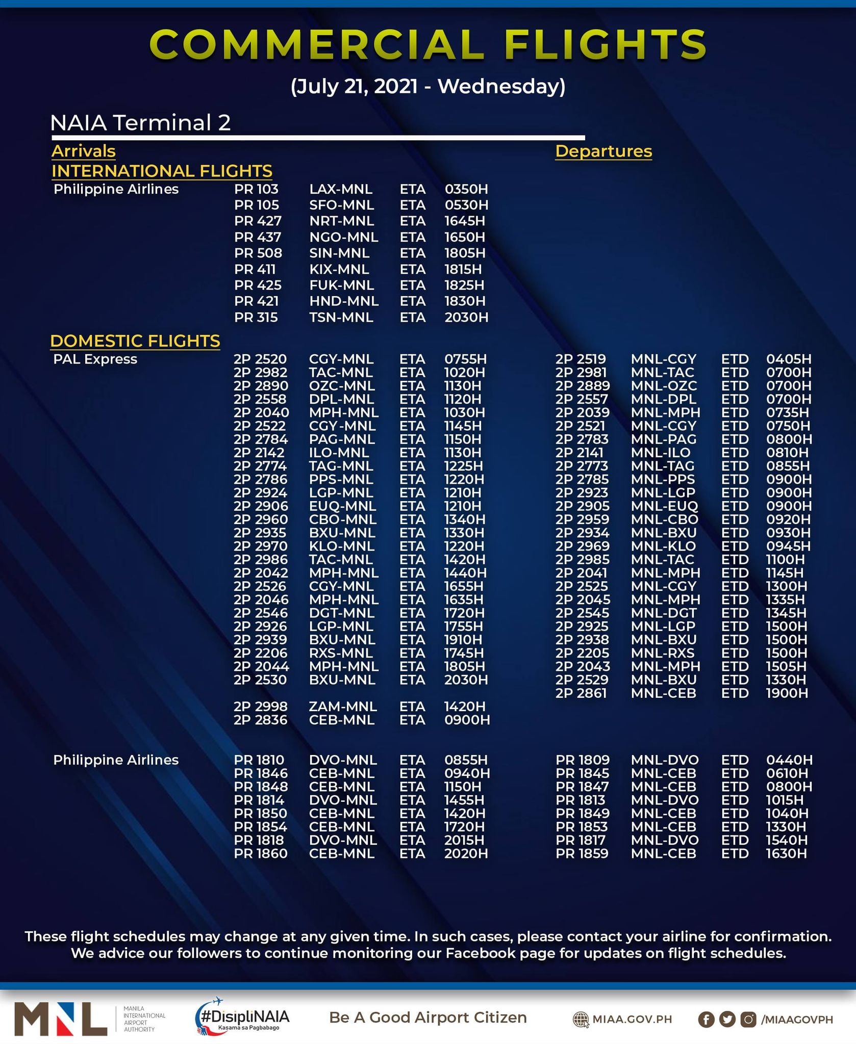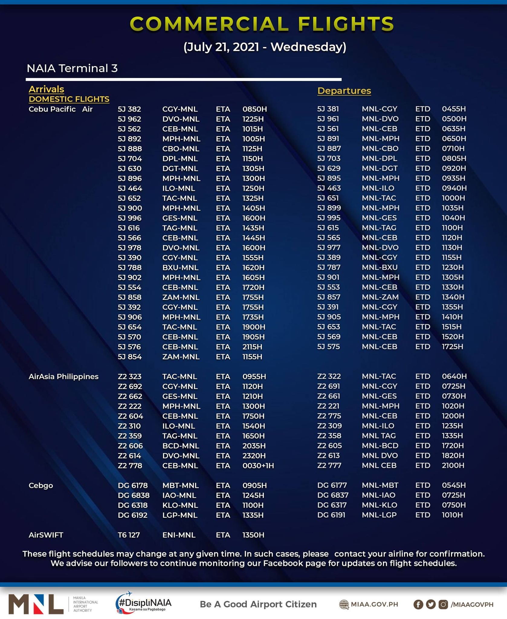 (Eagle News) — The Manila International Airport Authority has released its list of operational commercial flights for Wednesday, July 21: