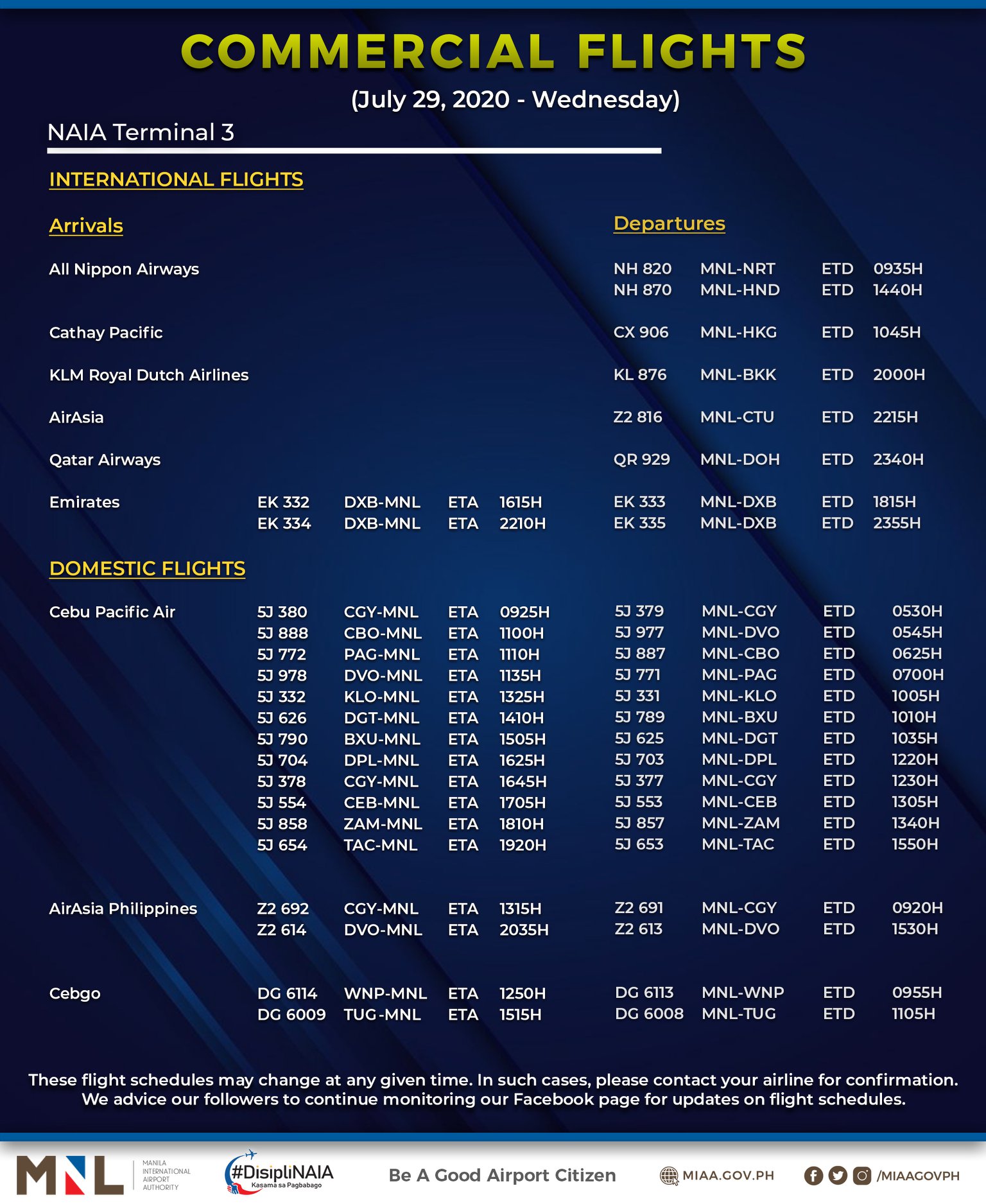 (Eagle News) — The Manila International Airport Authority has released its list of operational commercial flights for Wednesday, July 29: