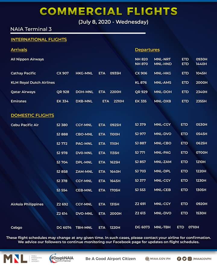 (Eagle News)–The Manila International Airport Authority has released its list of operational flights for Wednesday, July 8: